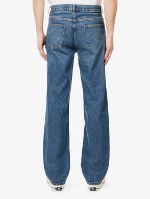 Mid-rise fit, barrel-leg cut, belt loops, four pockets, twisted seams through legs, dropped crotch, faded finish