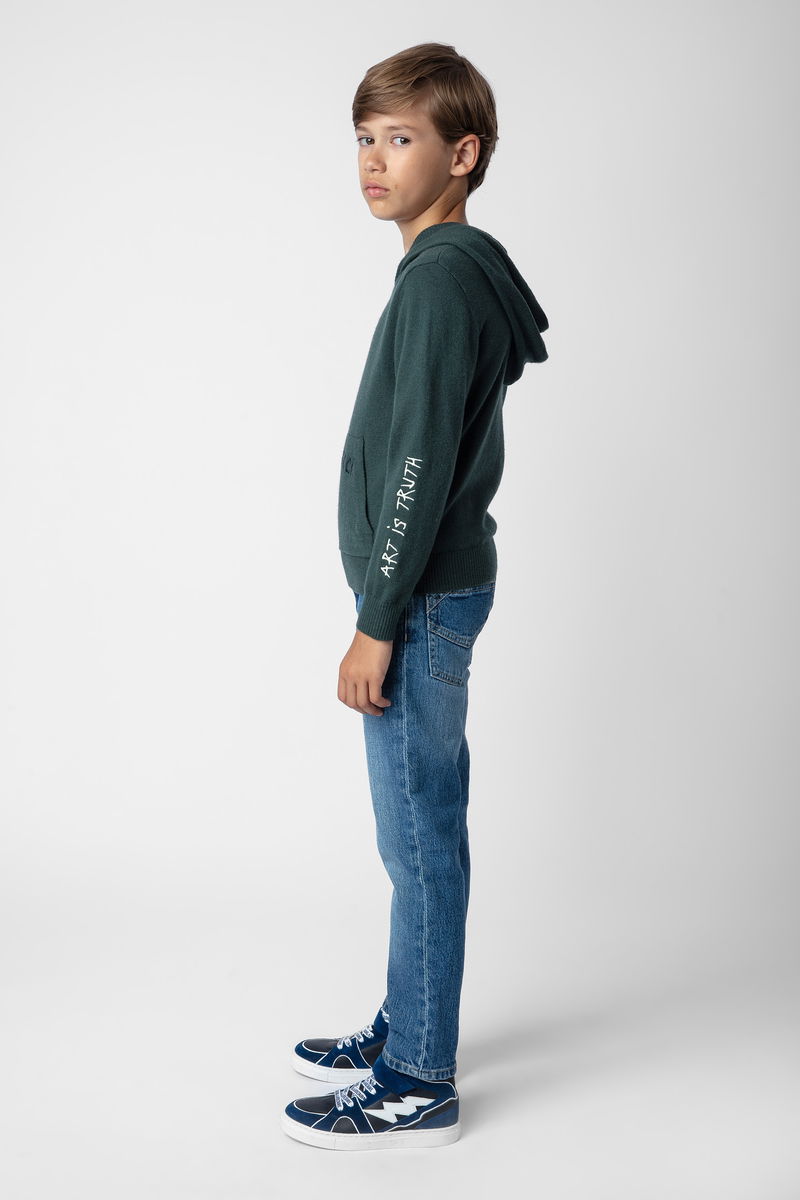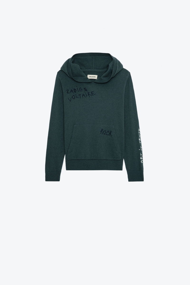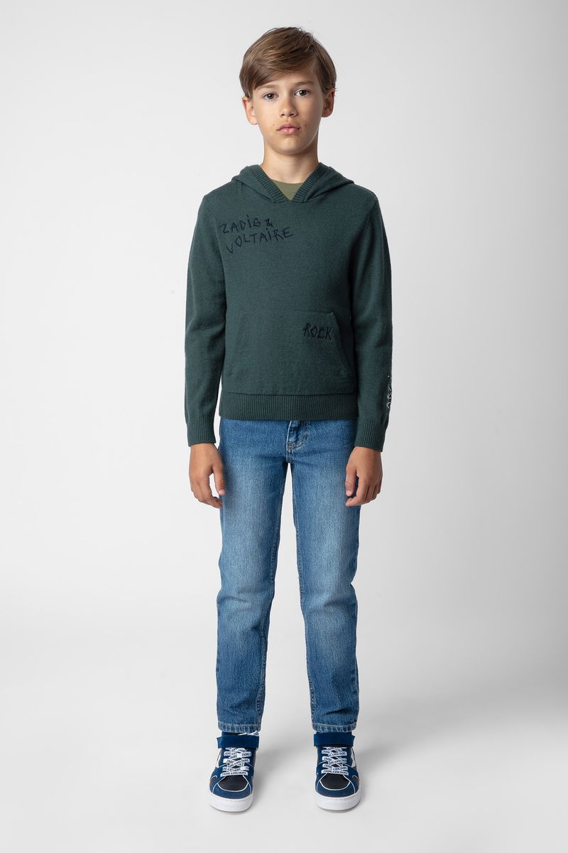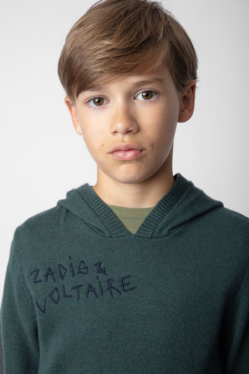 Boys’ Dark Green knit sweatshirt. Hood and front pocket. Rubber slogans and embroidery. Long sleeves.