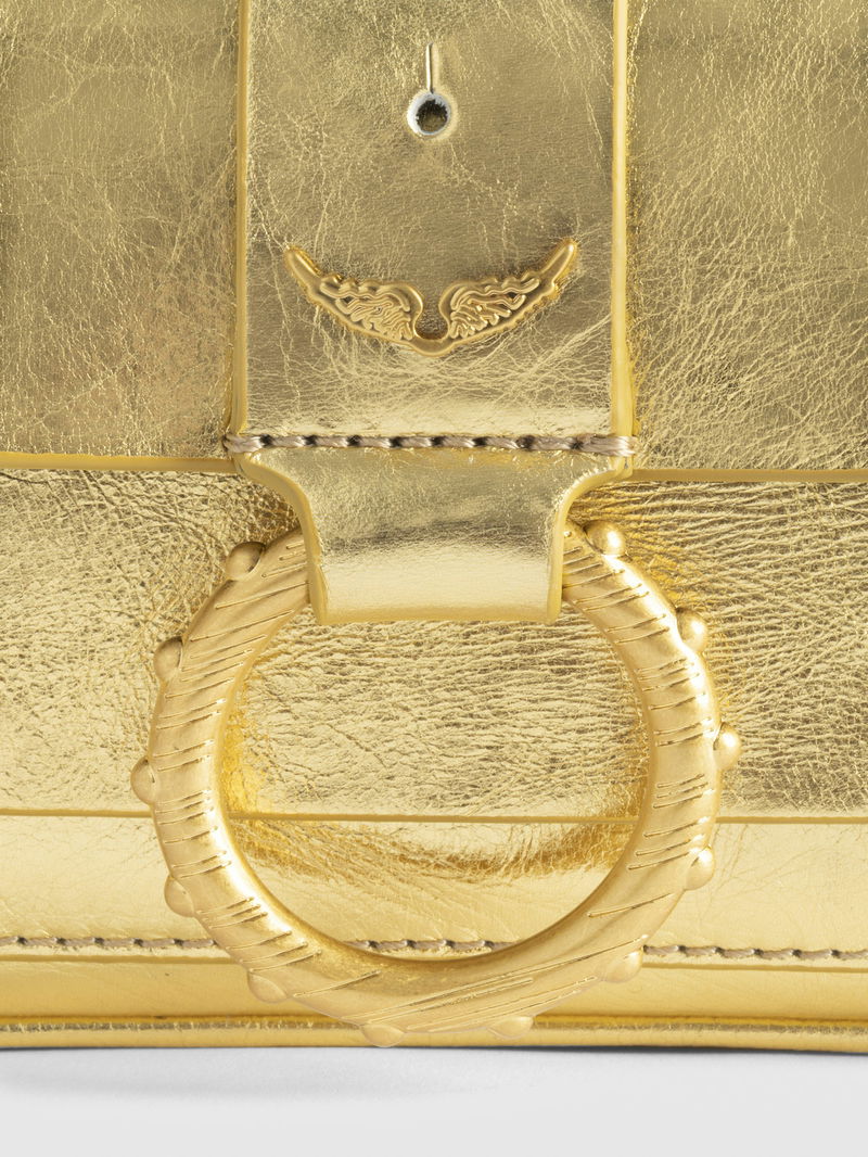 Mini bag in metallic leather. Designed by Kate Moss for Zadig& Voltaire. "Kate Moss: Live and Love" signature. Detachable metal chain. Flap with magnetic closure. Two compartments separated by a zipped pocket and 2 card slots. Wings, metal ring engraved "Kate Loves Zadig&Voltaire" and studded piping. Carried by hand, on the shoulder or crossbody.