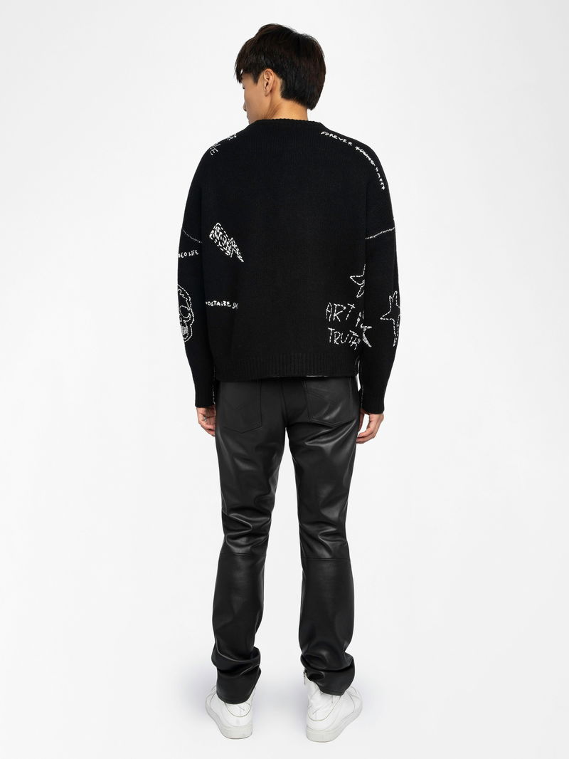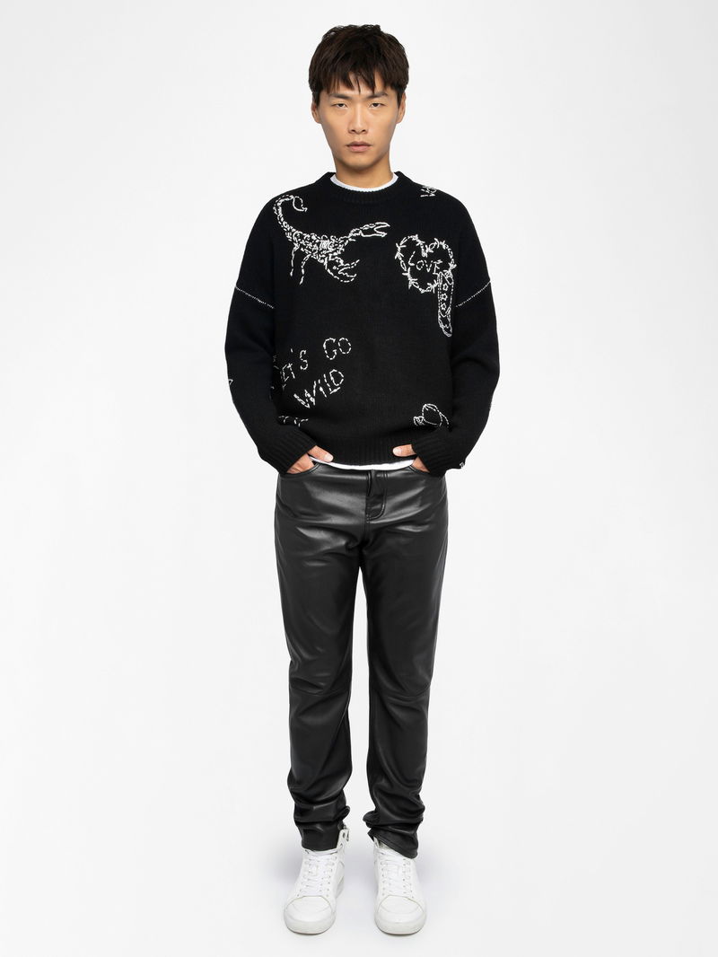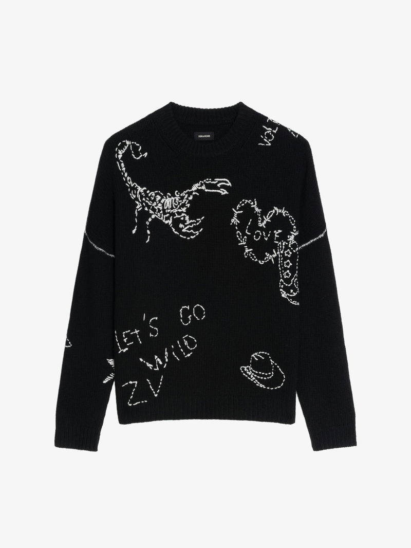 Jumper in 100% merino wool. Jacquard pattern and embroidery. Round neck. Long sleeves.