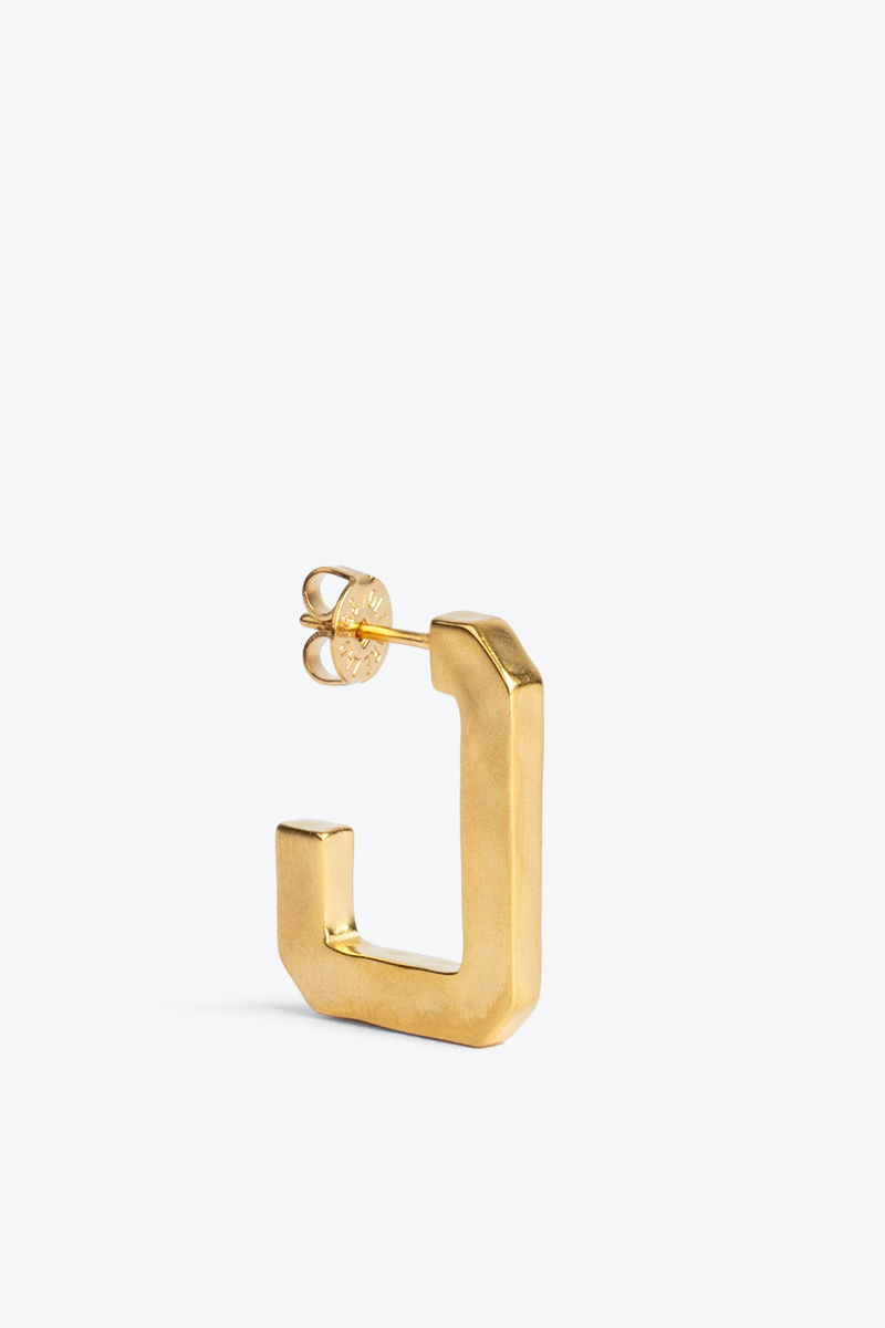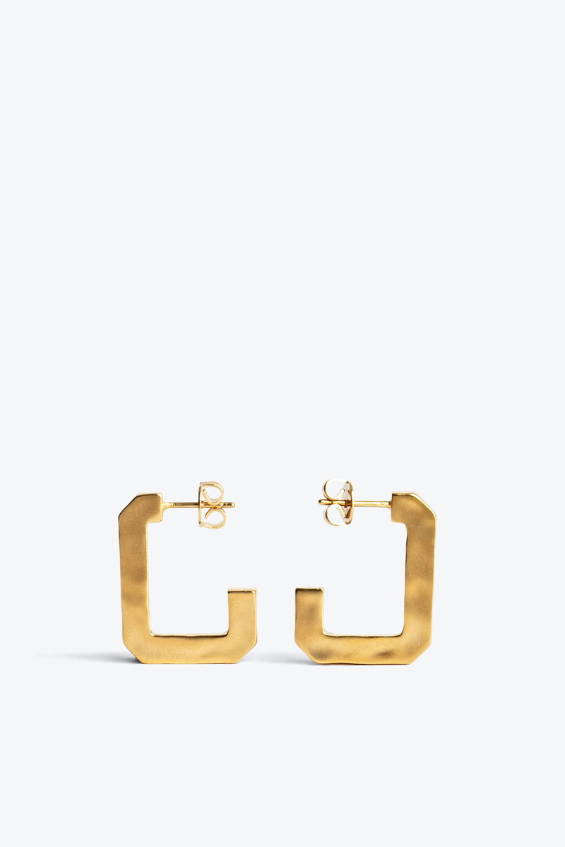 Women’s small C-shaped earrings in distressed hammered gold-tone metal.