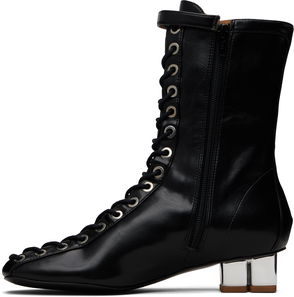 Women’s black vegetable tanned leather zip-up low ankle boots - Tab with press stud - Overstitching, strap and leather reinforcement - O-ring with harness straps, chain and metal wings - Square toe - Heel height: 4.5 cm. The sole and heel were hammered by hand to give the shoe a naturally distressed finish. Because of this, each shoe is different.