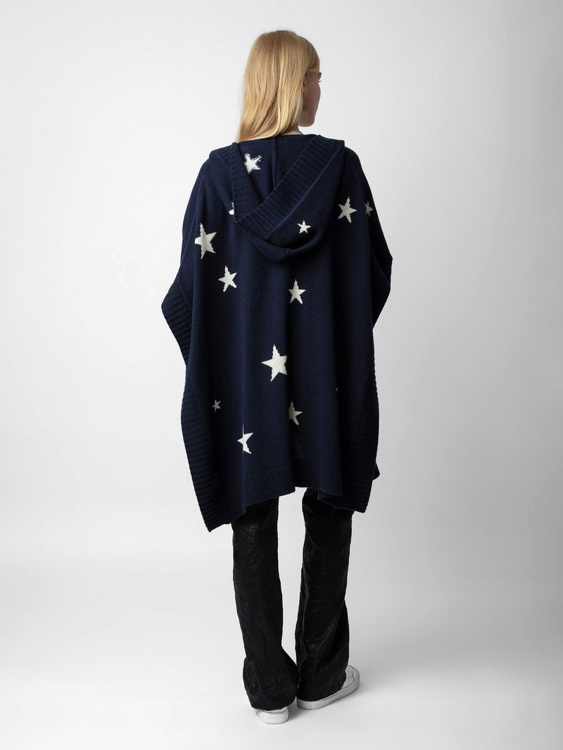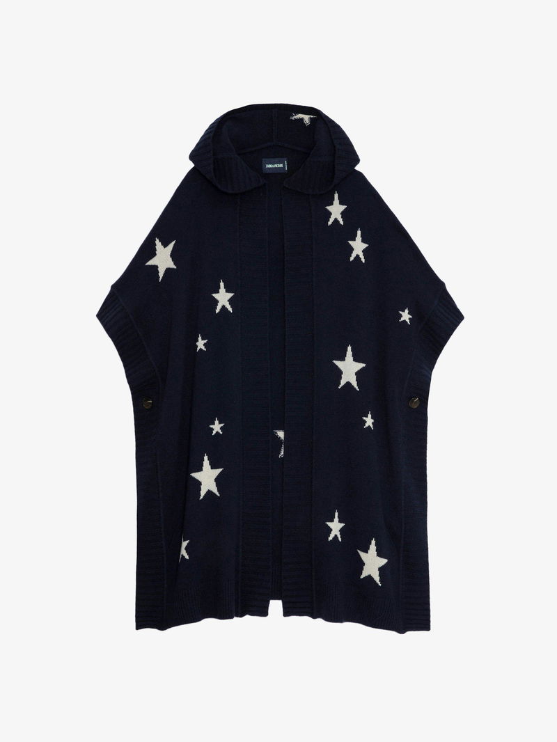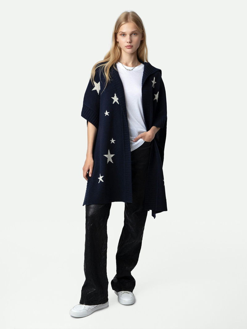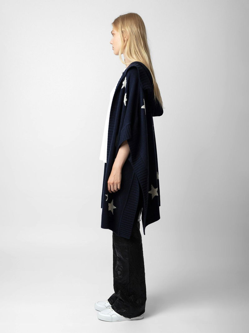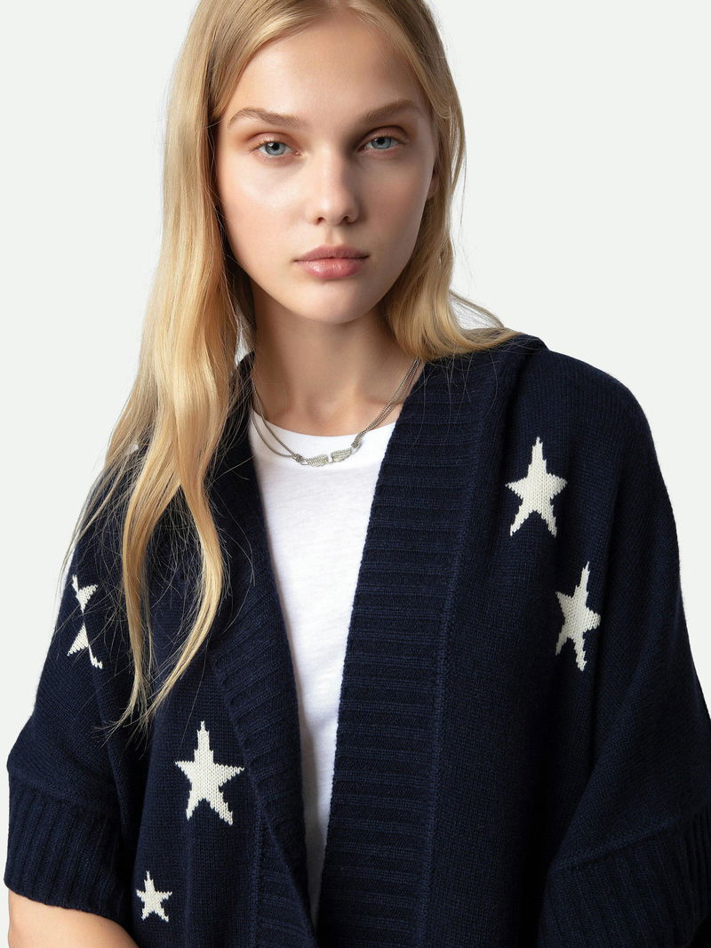 Women’s long Encre navy blue cashmere cardicoat. Contrasting intarsia jacquard star motifs and ribbed ZV signature - Hood - Short buttoned sleeves and ribbed trim.