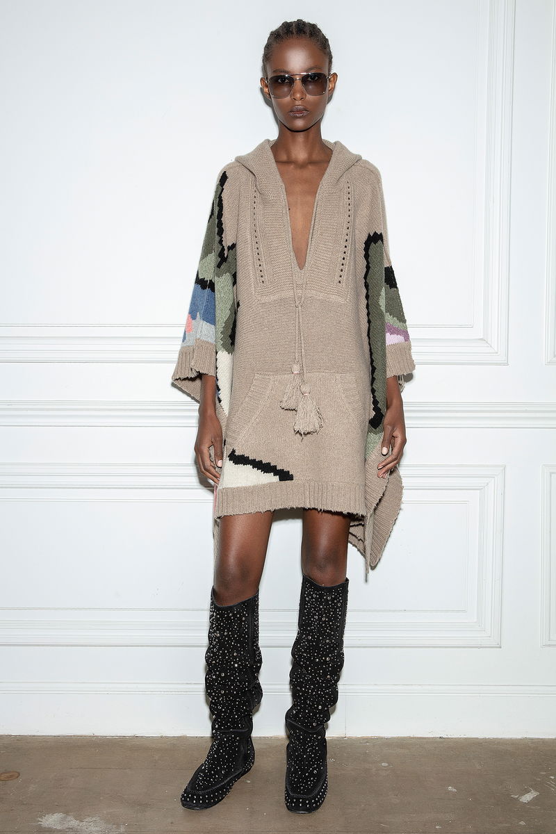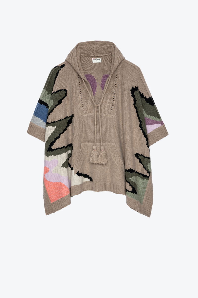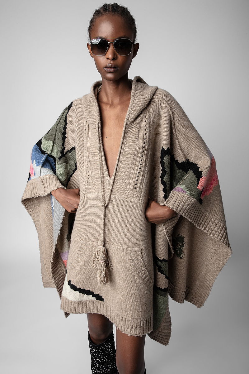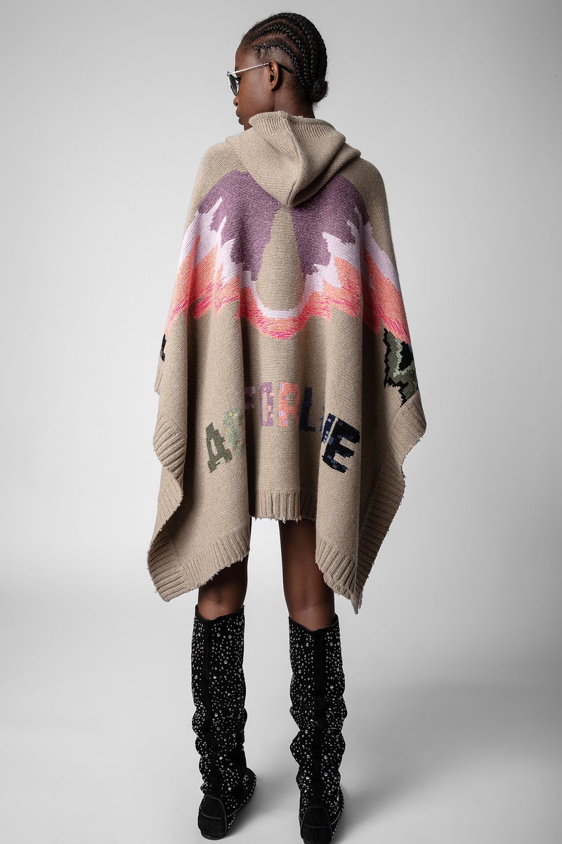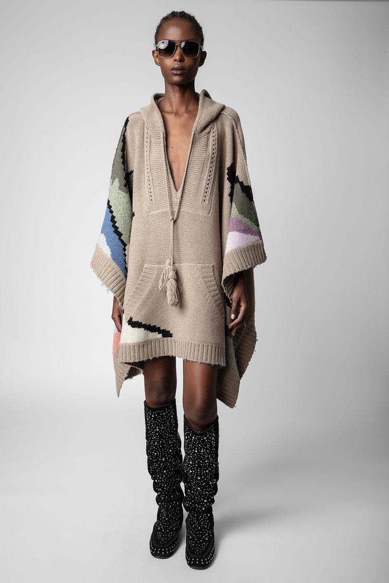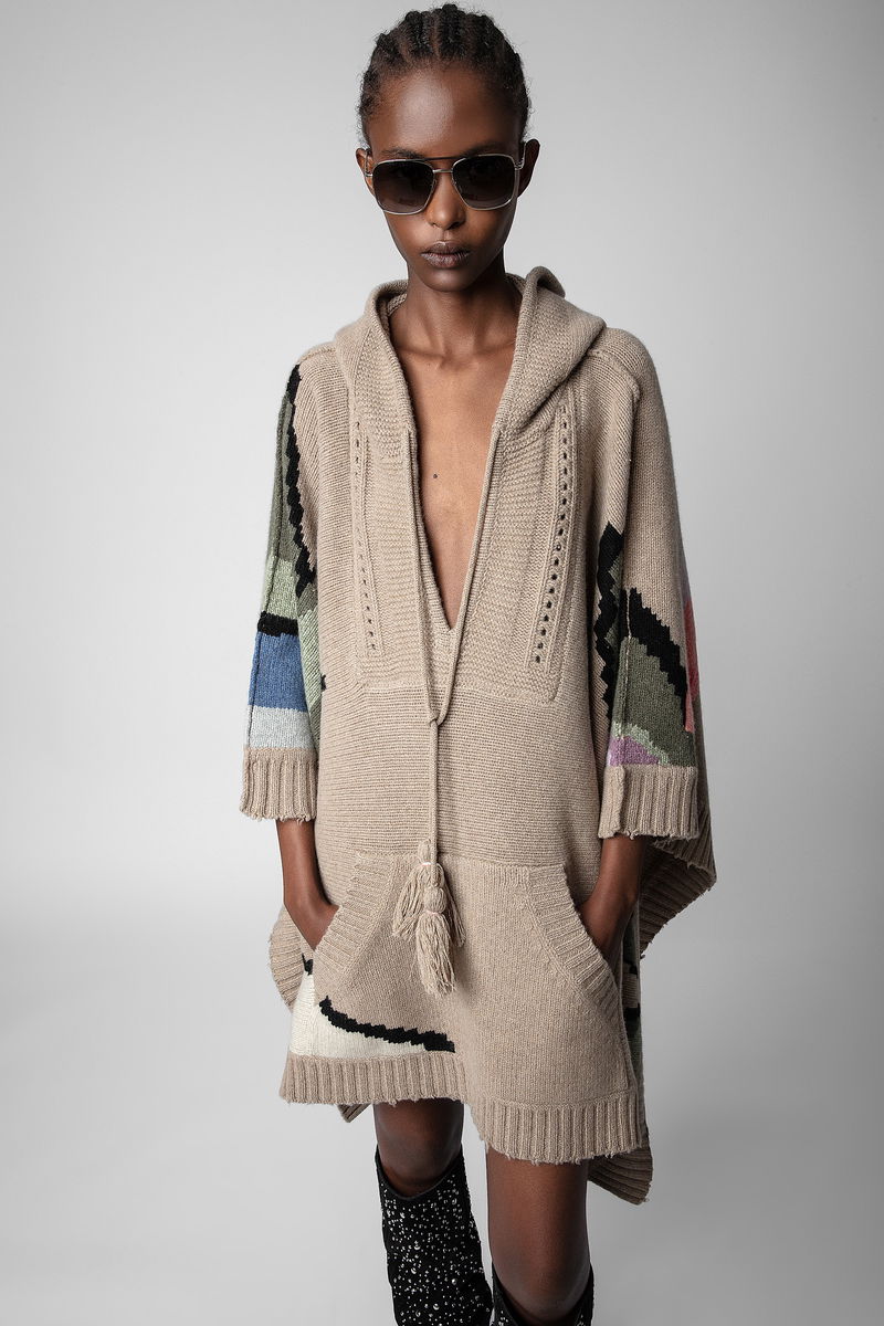 A truly exceptional piece, the Iwanda poncho in cashmere and wool is light and incredibly soft. It features colourful intarsia patterns on the front and back, short sleeves and a drawstring hood with tassels.