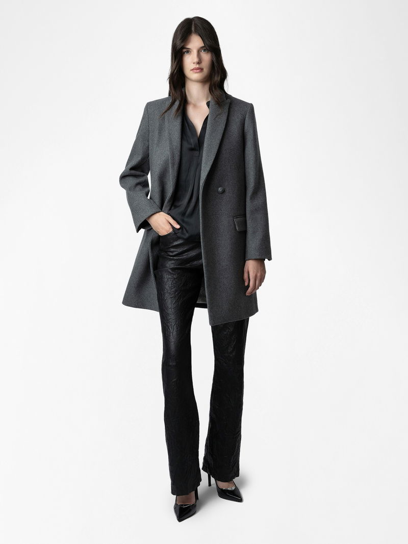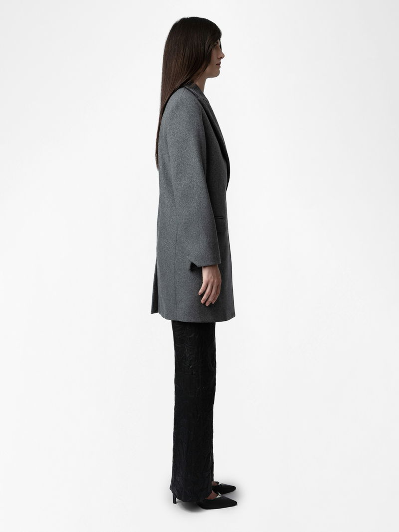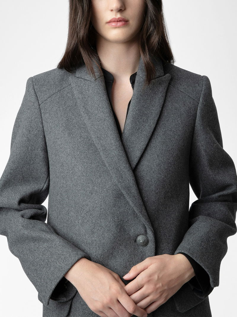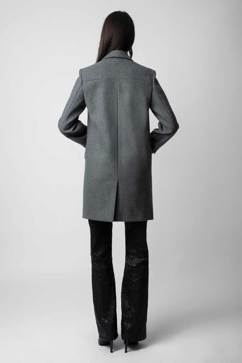 Mid-length coat. Straight cut. Long sleeves. Button closure. 2 flap pockets. Back vent.