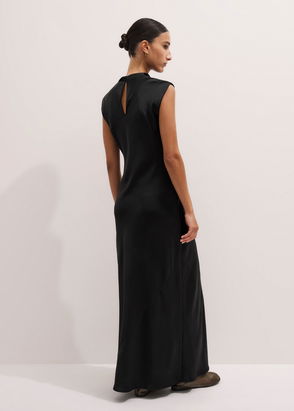 Women’s long black flowing satin dress. Round neckline and cutaway shoulders. Flared skirt with split.