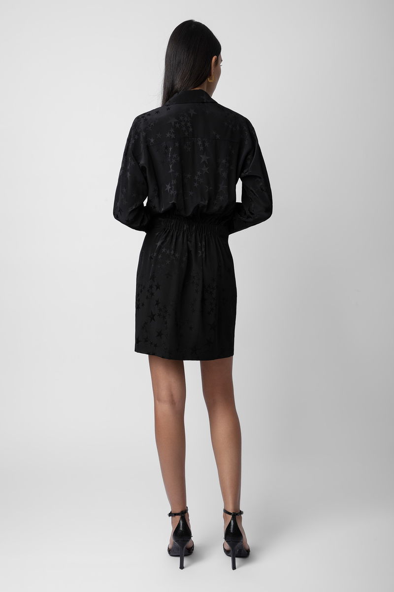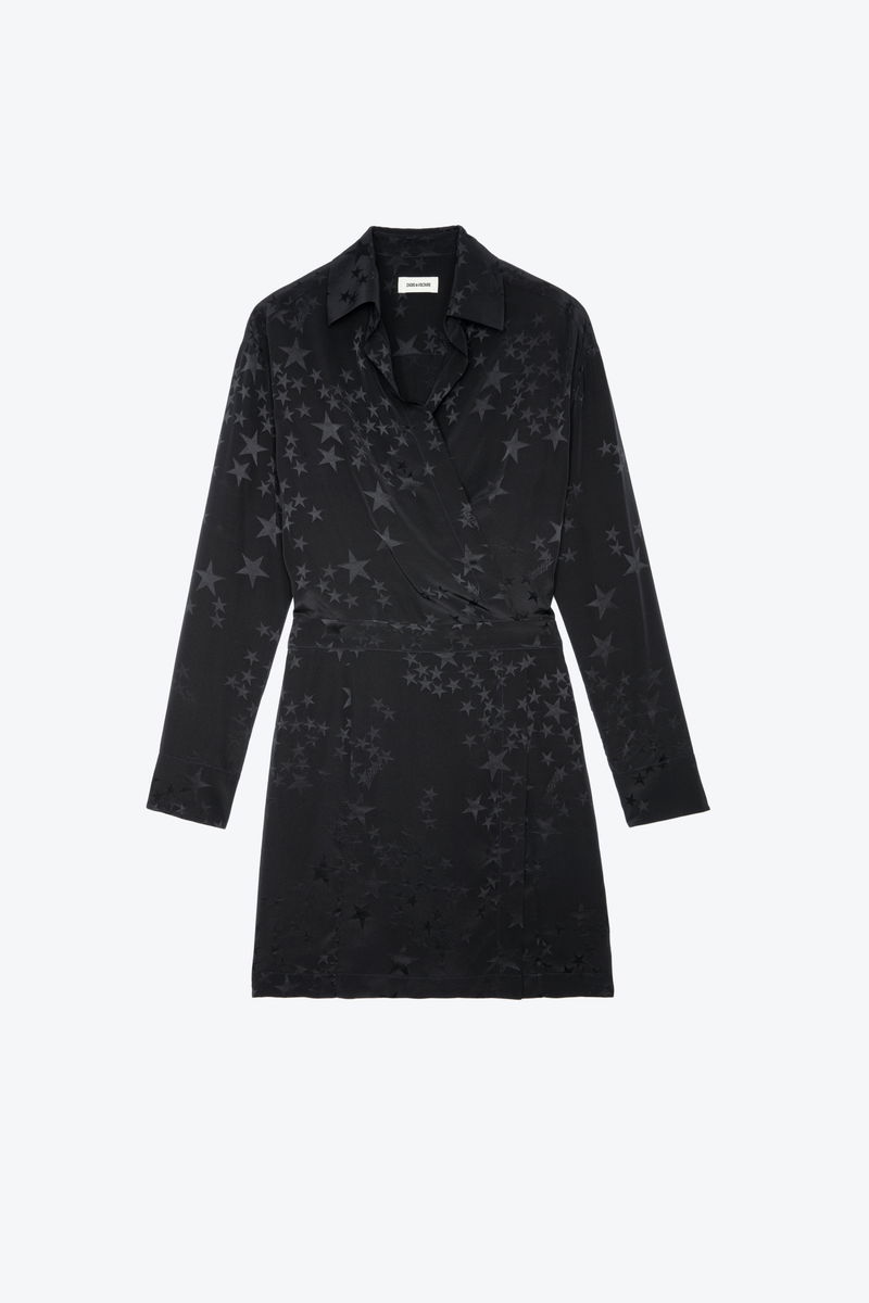 Women’s short structured black dress. Star jacquard silk. Shirt collar and wrap neckline. Long sleeves and buttoned cuffs. Smocked on the back.