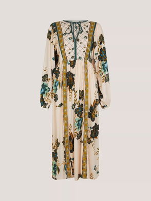 Mid-length dress - Leopard print - Deep V-neckline - Long sleeves - Fluid cut.