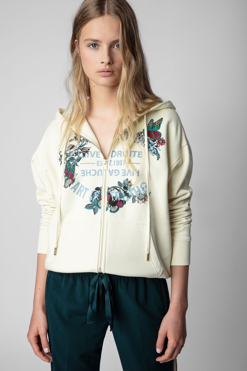 This zip-up hoodie in ecru cotton is decorated with floral motifs and the brand’s badge.