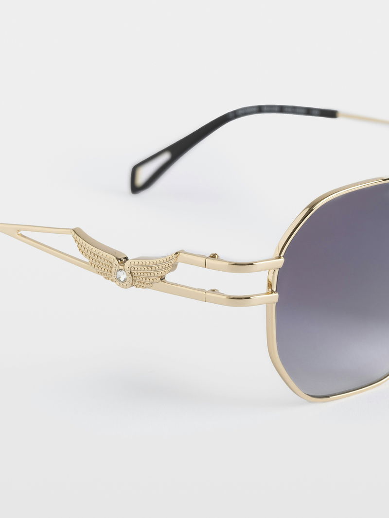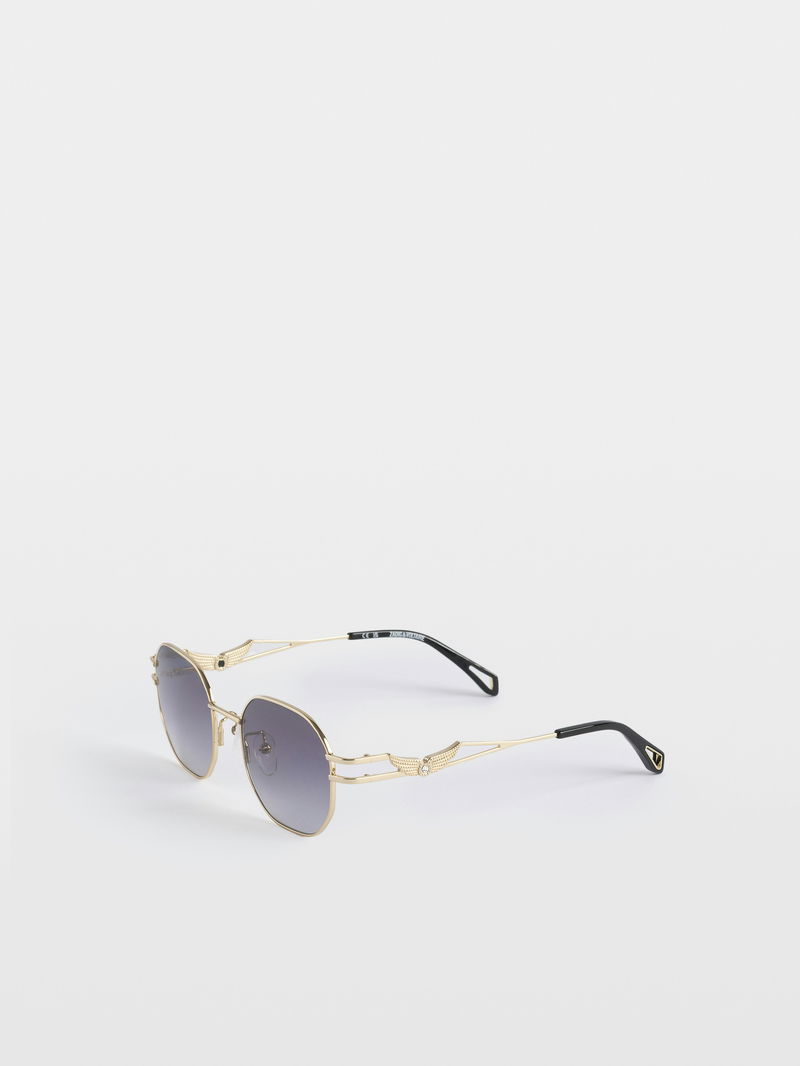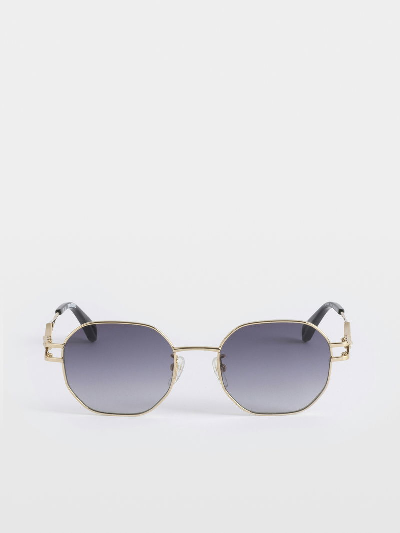 Unisex metal sunglasses. Details on the temples. Blue tinted lenses. UV protection category 2.