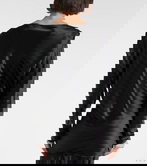 This airy, satiny top plays with volume and an asymmetrical drape. Its fitted waist, drape and ruffled details create a chic, alluring look.
