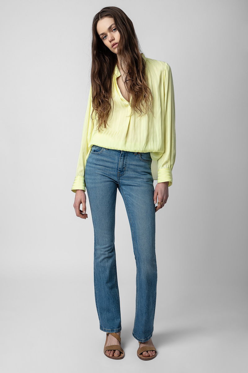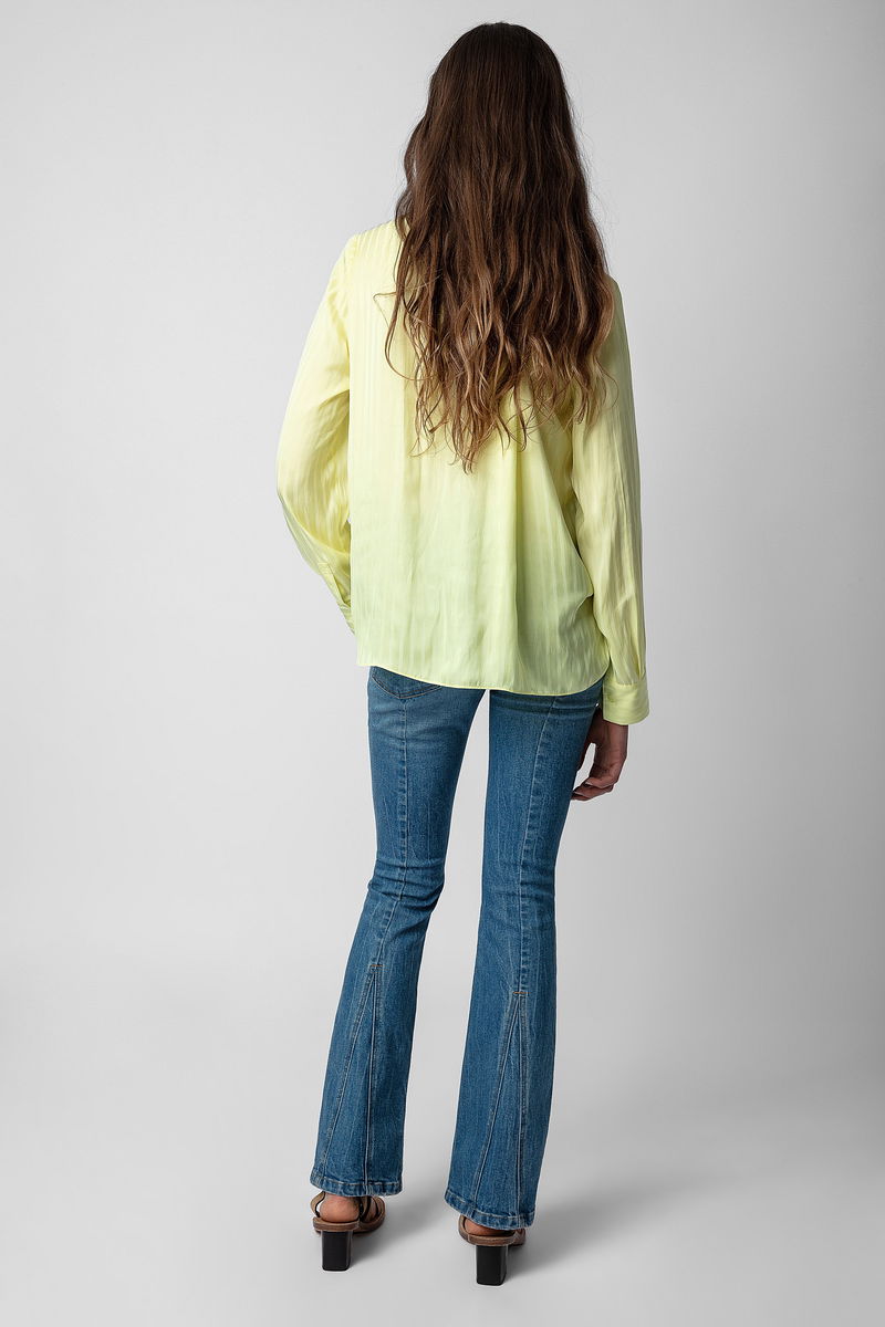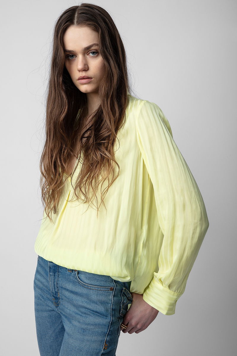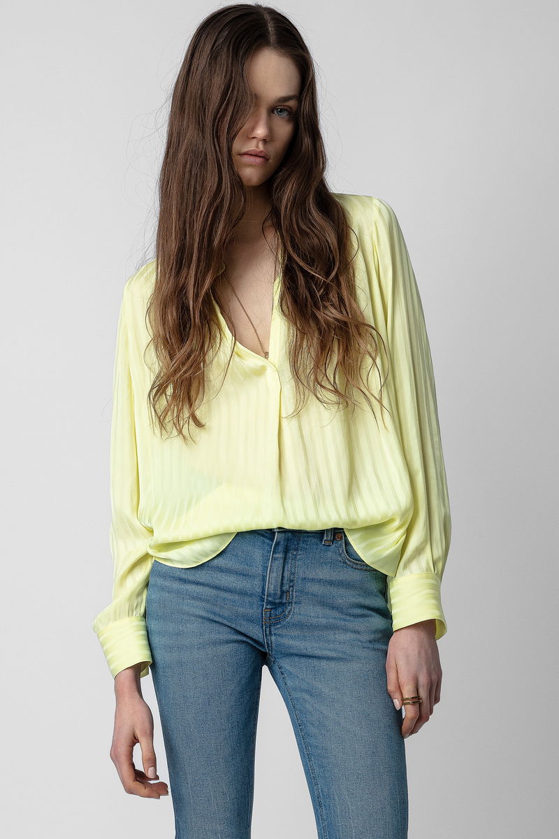 Zadig & Voltaire’s iconic Tink blouse is available this season in a satiny striped yellow version. With long sleeves and an open neckline, it can be worn casually with jeans or in rock style with leather trousers.