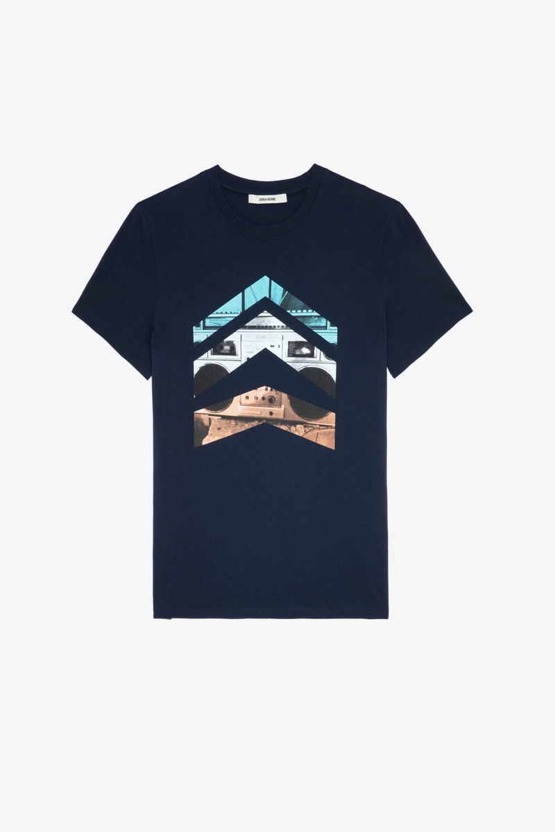 Men’s ink blue cotton T-shirt. Arrow print on the front. Round neck and short sleeves.