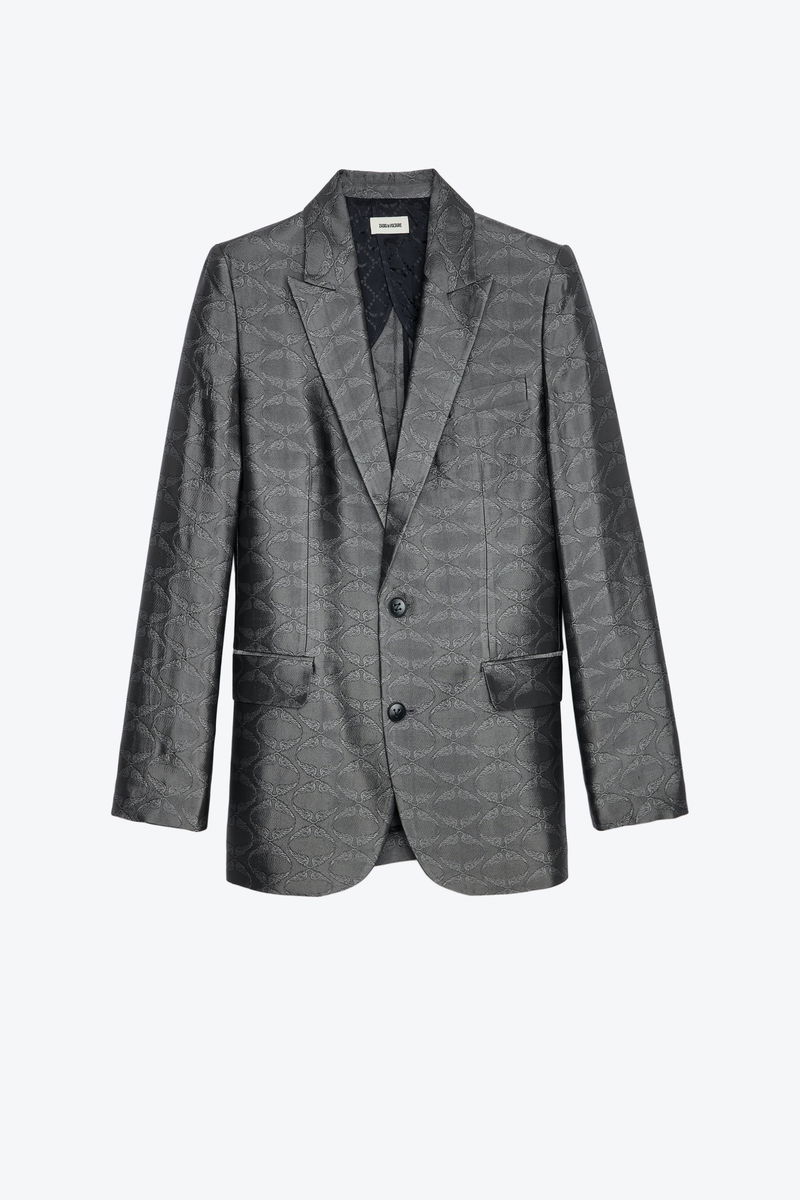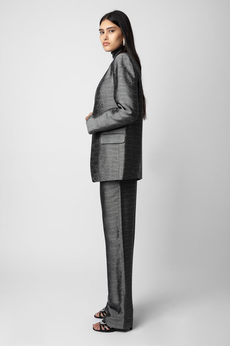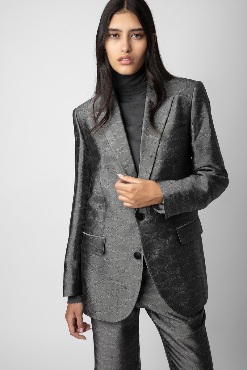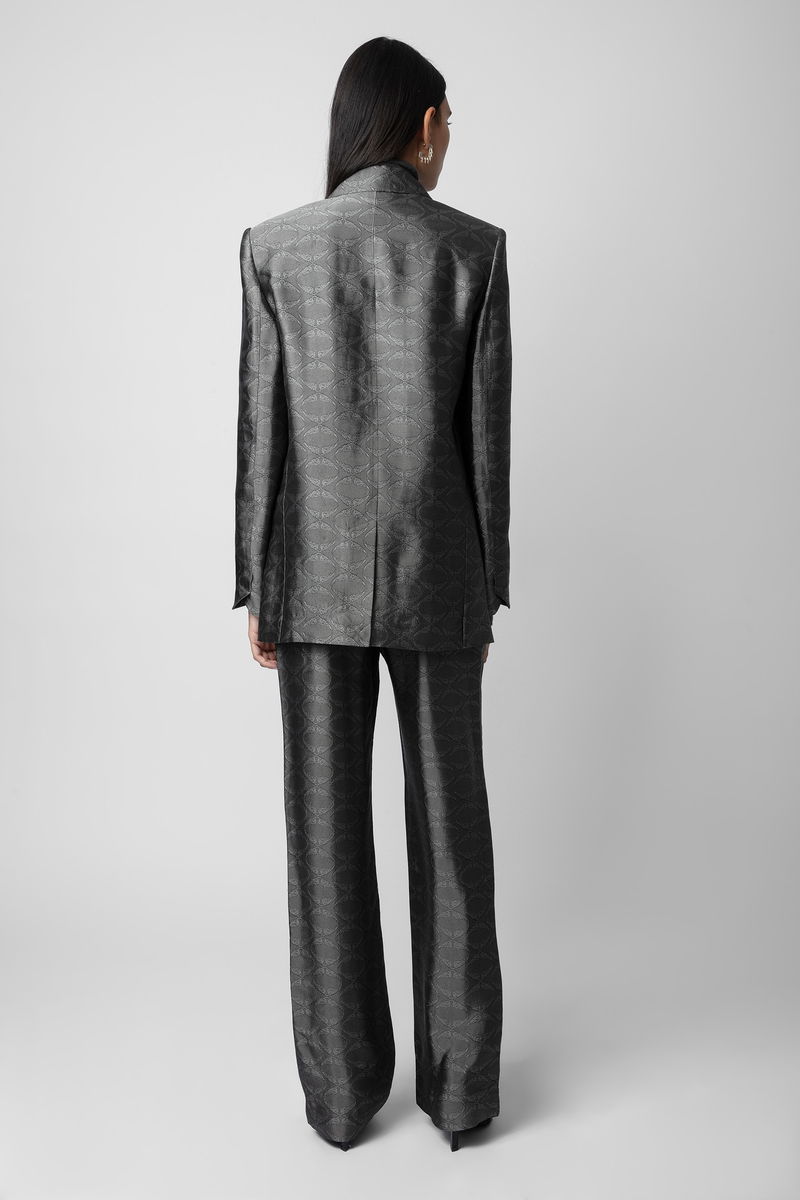 Women’s anthracite wing-print jacquard blazer. Masculine, structured cut. Double-breasted fastening and slit to the back. Pointed collar, shoulder pads, long sleeves with mitred cuffs. 2 flap pockets and 1 piped breast pocket.