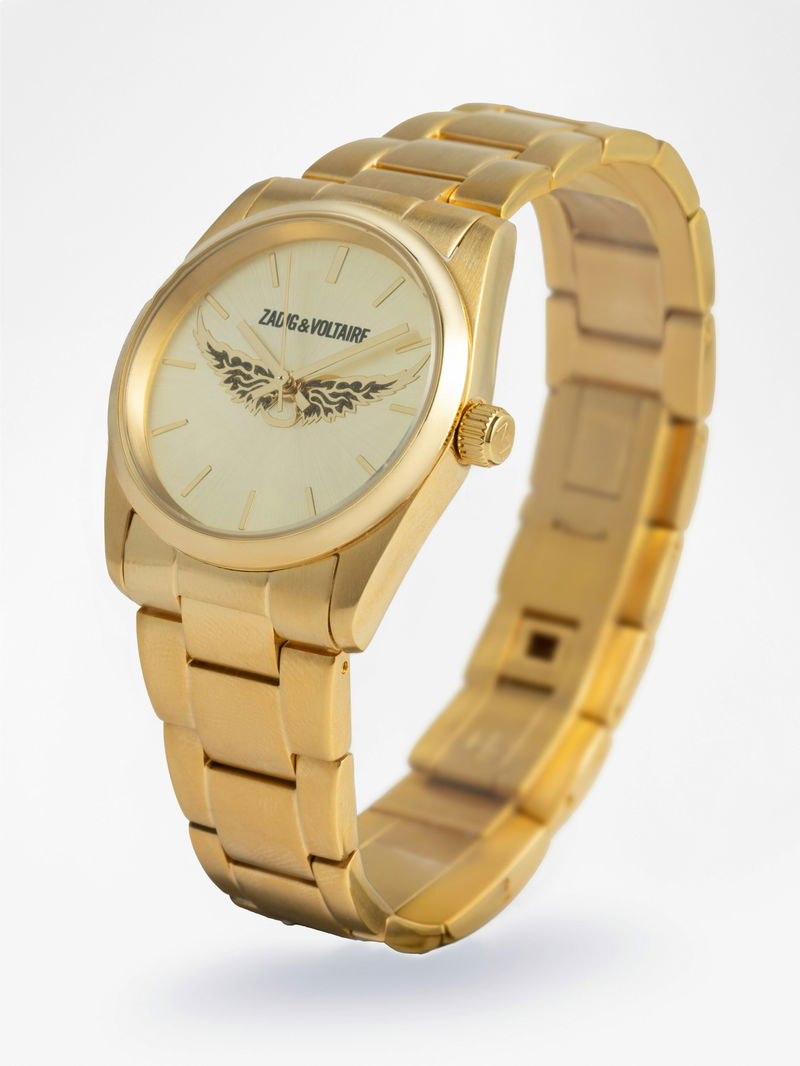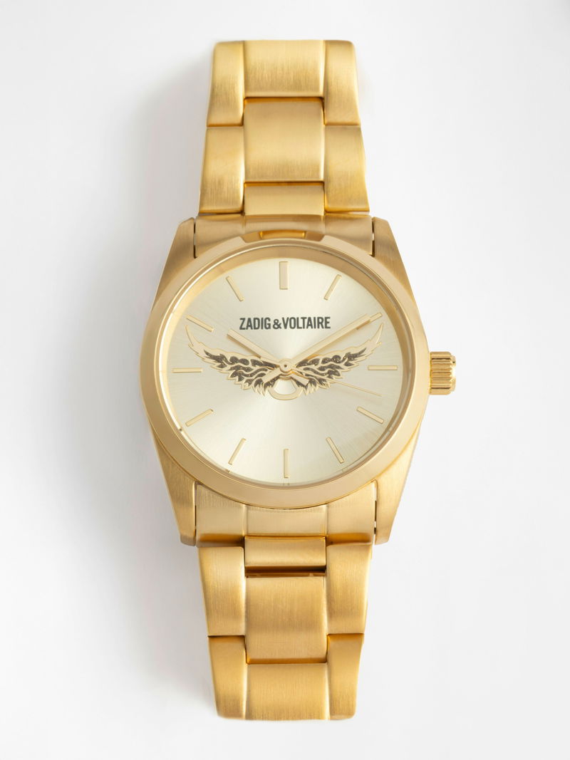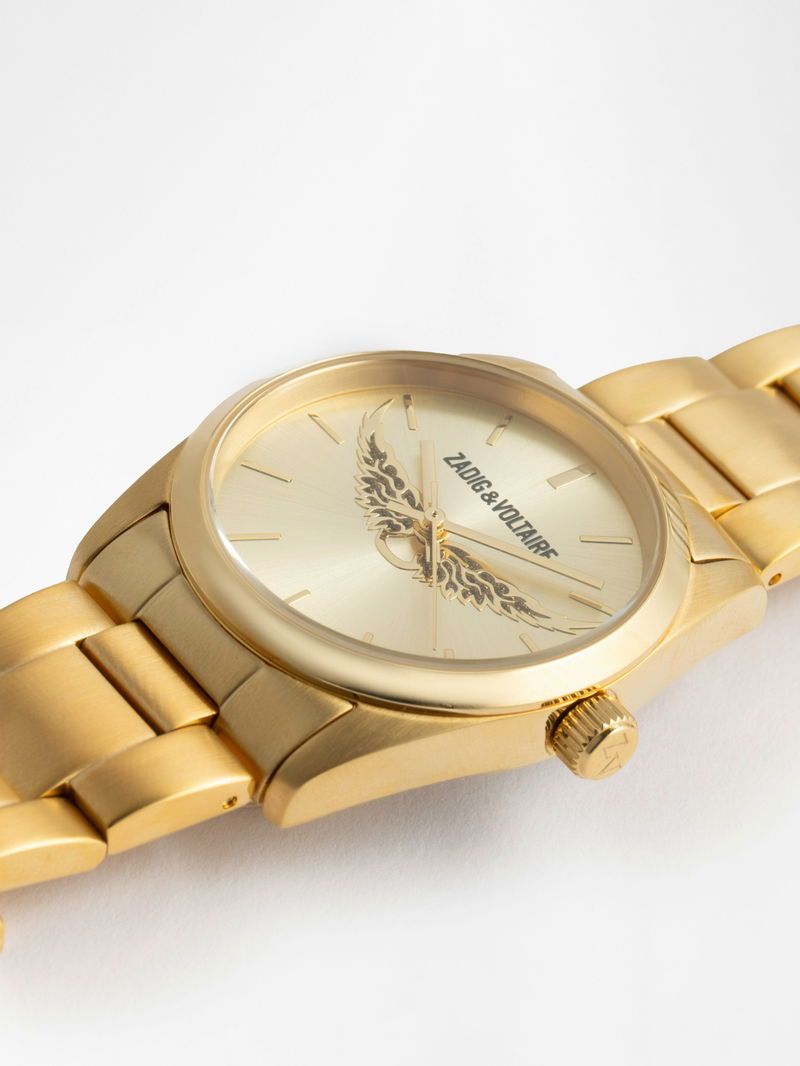 Stainless steel watch. Round case diameter 33 mm, gold dial with butterfly. Quartz movement. Functions: hour/minute. Water resistant to 5 bar. Steel bracelet.