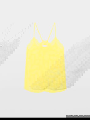 Women's Vanille light yellow silk lingerie-style camisole - Diamanté, jacquard wings, floral embroidery and "Love Yourself" message and lace strips - V-neckline - Lace racerback and thin non-adjustable straps - Lined.