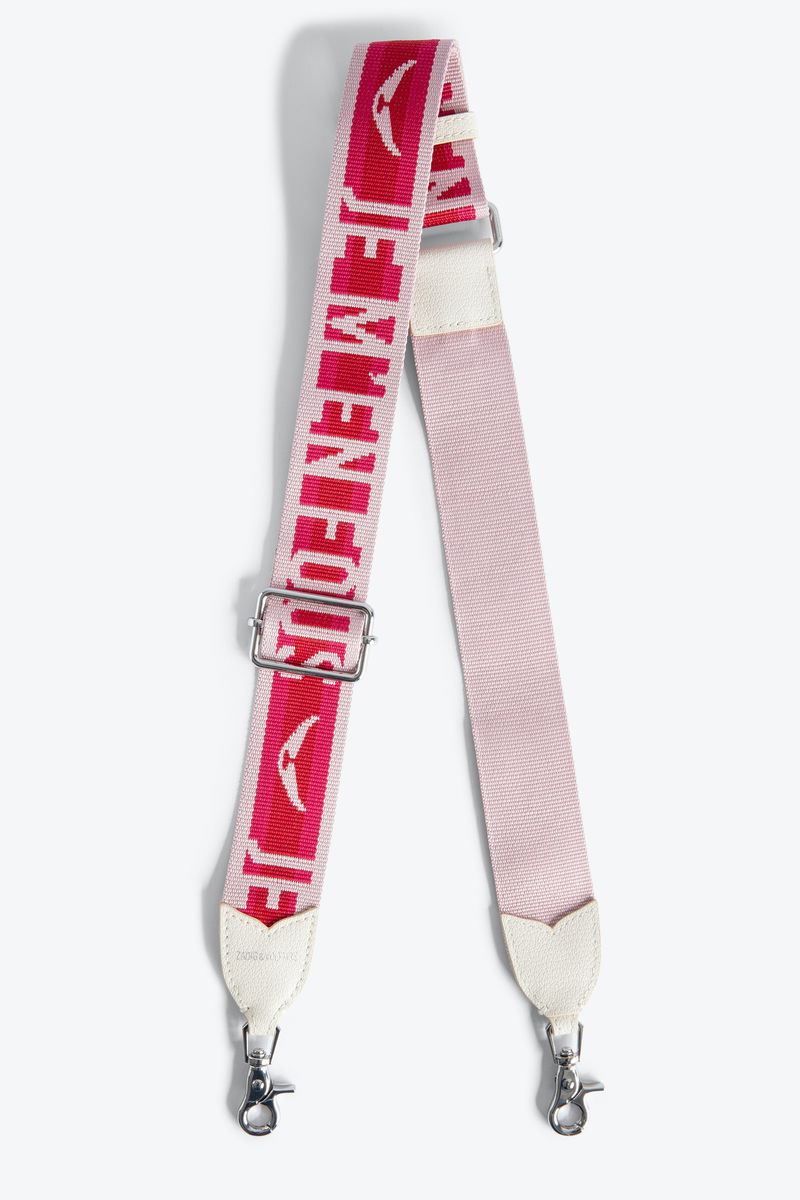 Podium pink leather and nylon shoulder strap. Adjustable and removable. Snap hooks. Contrasting “Je m’en fous” slogan and wings motif. White grained leather panels and wings charm.
