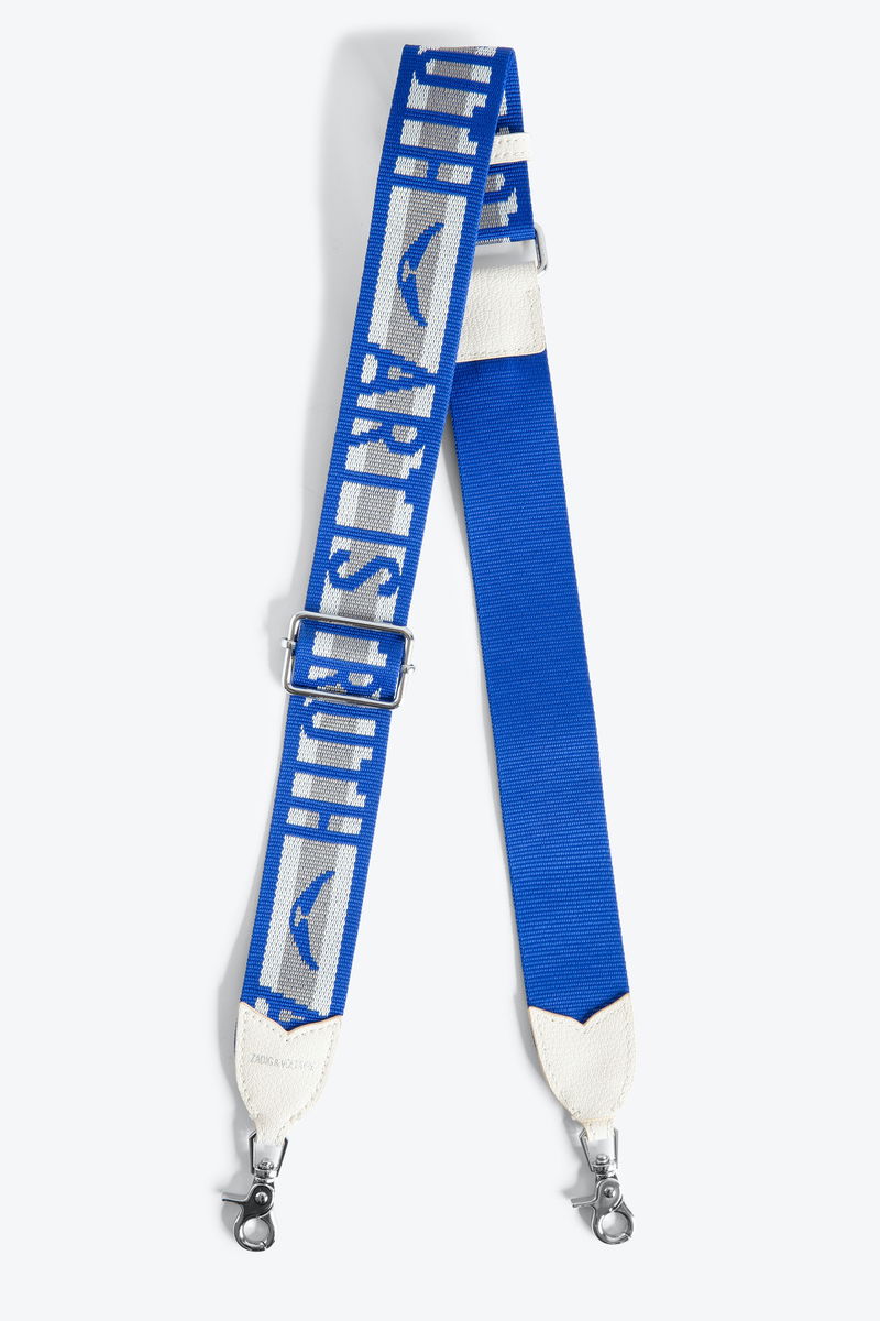 Mind blue leather and nylon shoulder strap. Adjustable and removable. Snap hooks. Contrasting “Art is Truth” slogan - White grained leather panels and wings charm.