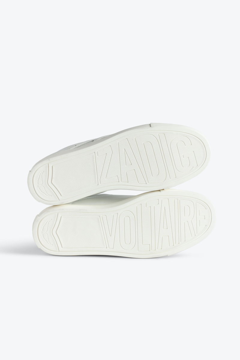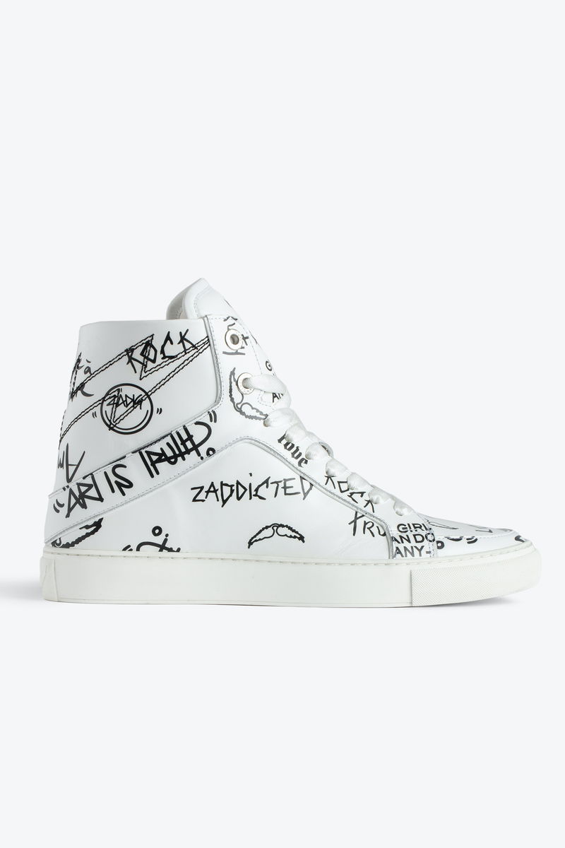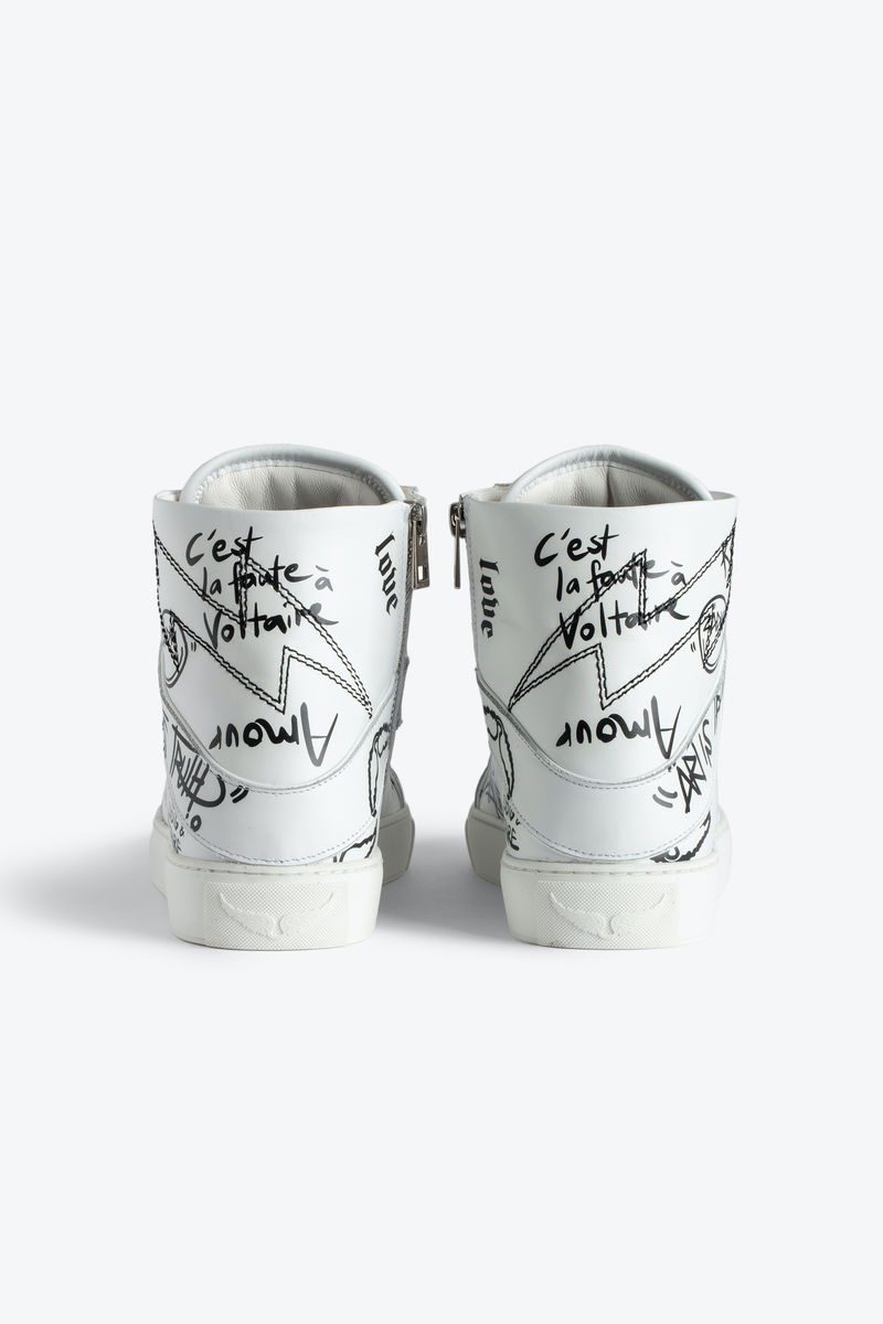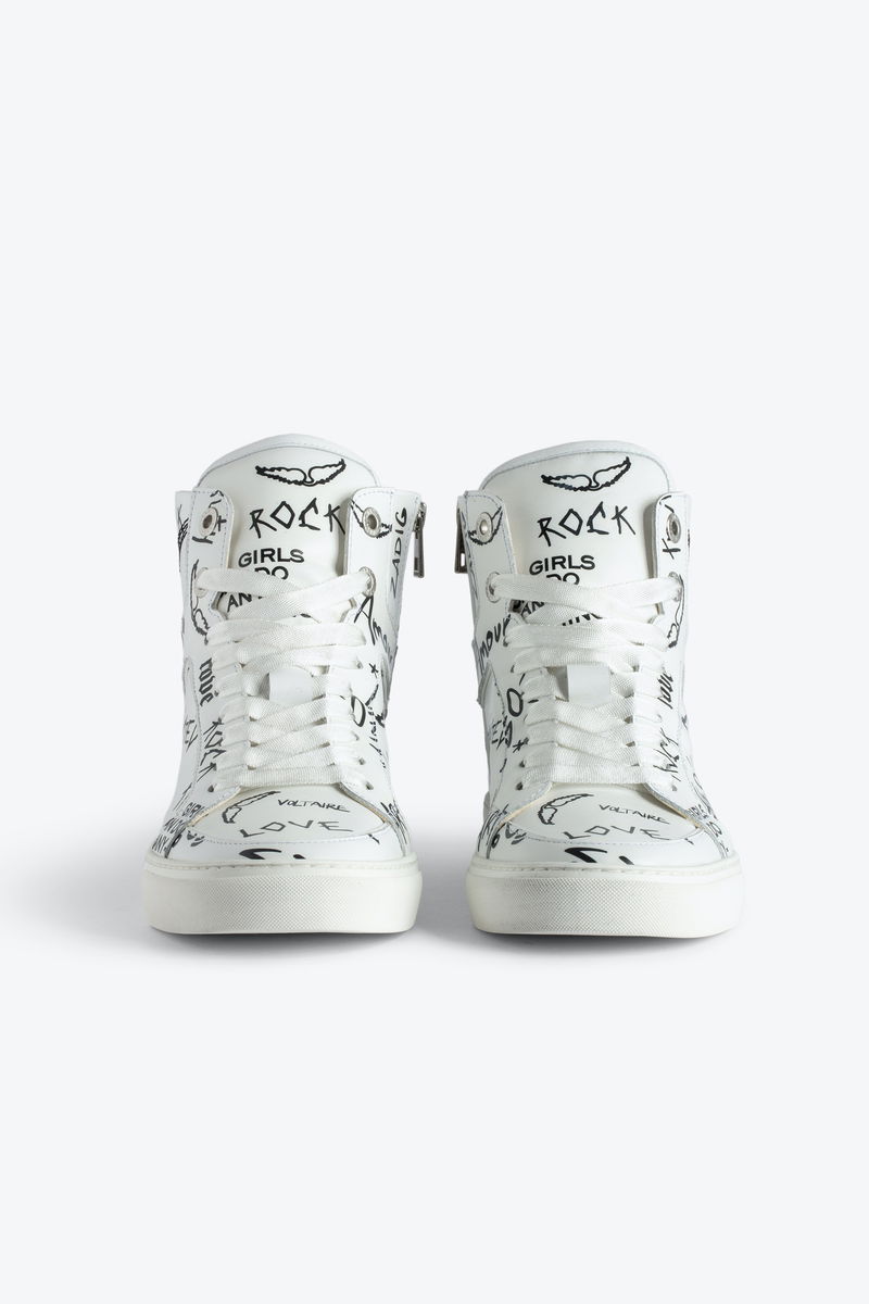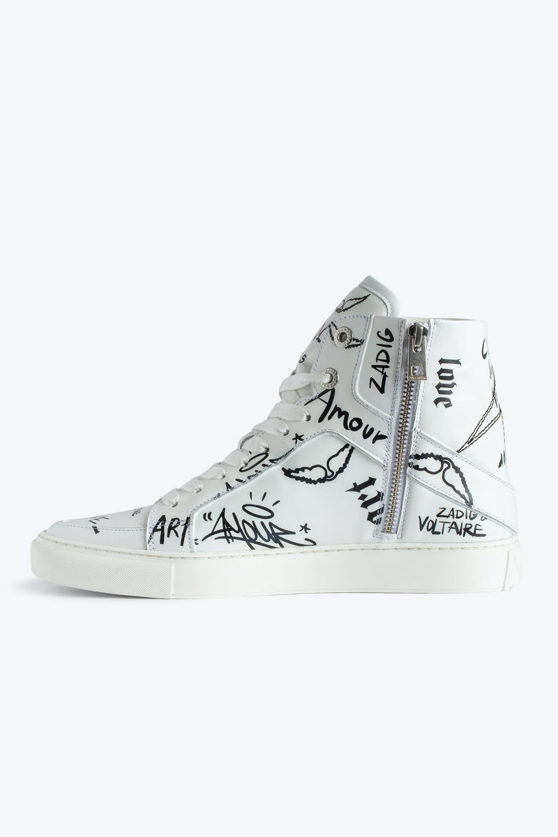 Women’s white high-top trainers with laces and zip. Combination of smooth leather and graffiti print. Lightning bolt overstitching and laces.