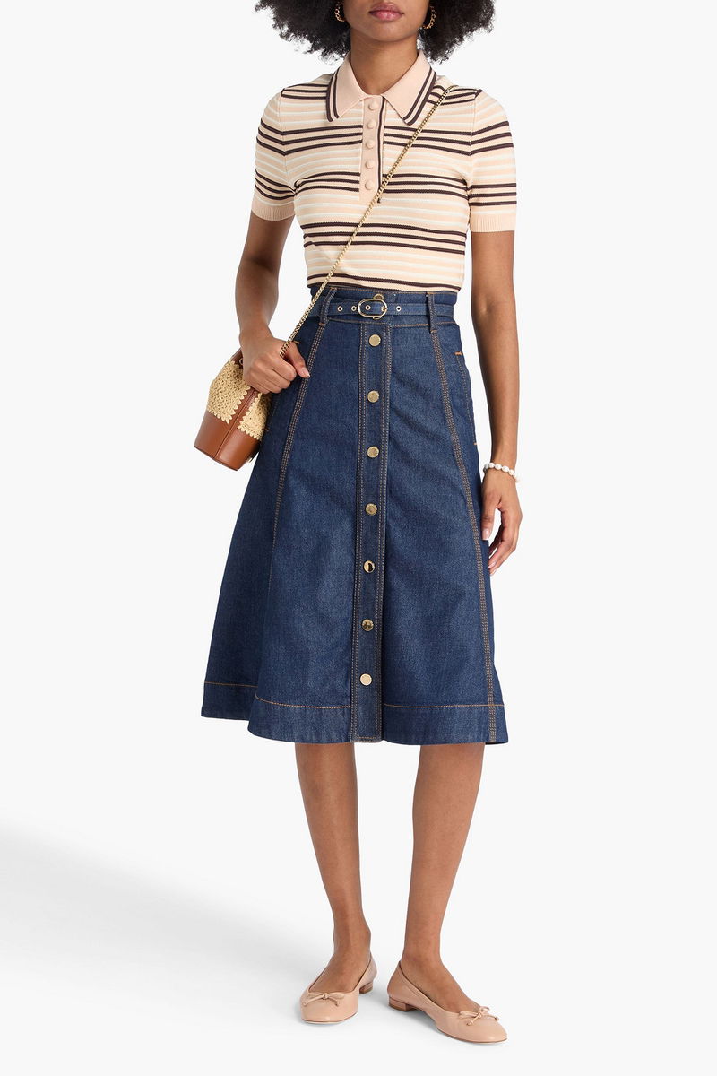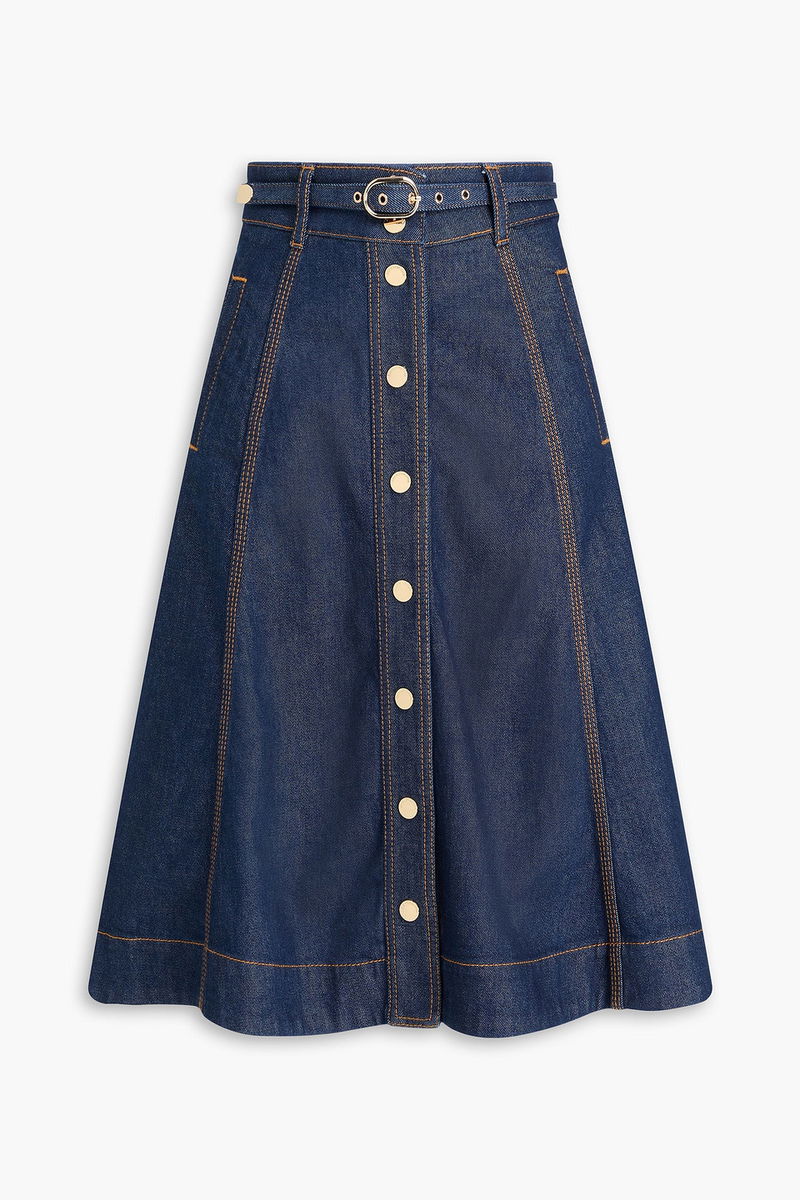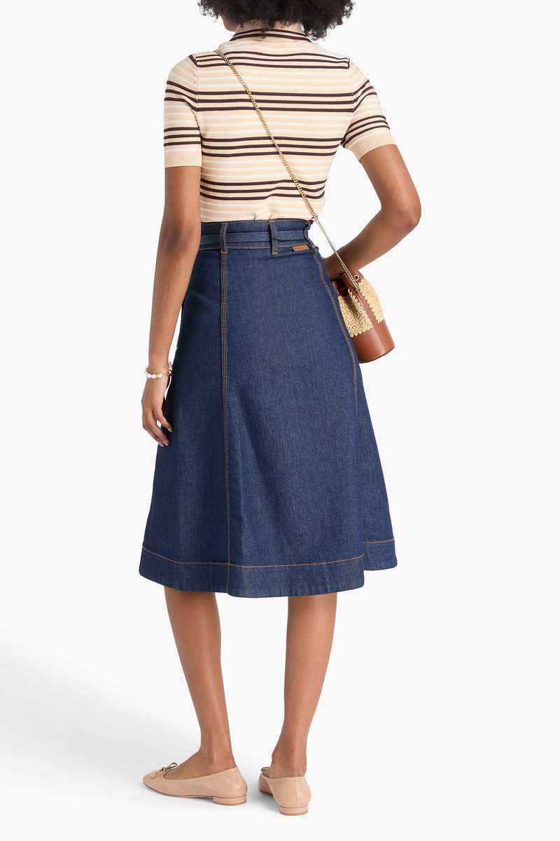 Skirt, Denim, Logo-appliquéd, Detachable belt, Side welt pockets, Snap fastenings through front, Mid-weight, slightly stretchy fabric.