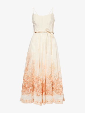 Zimmermann’s effortlessly romantic white polka-dot linen Corsage dress is captured in a tropical conservatory in the Resort 2019 lookbook. It’s crafted with an element of silk for softness, and features a ruched bodice with a row of fabric-covered buttons and subtle bows at the sides, then falls to a gathered hem panel with side slits. Style it with gold drop earrings for sun-kissed elegance.