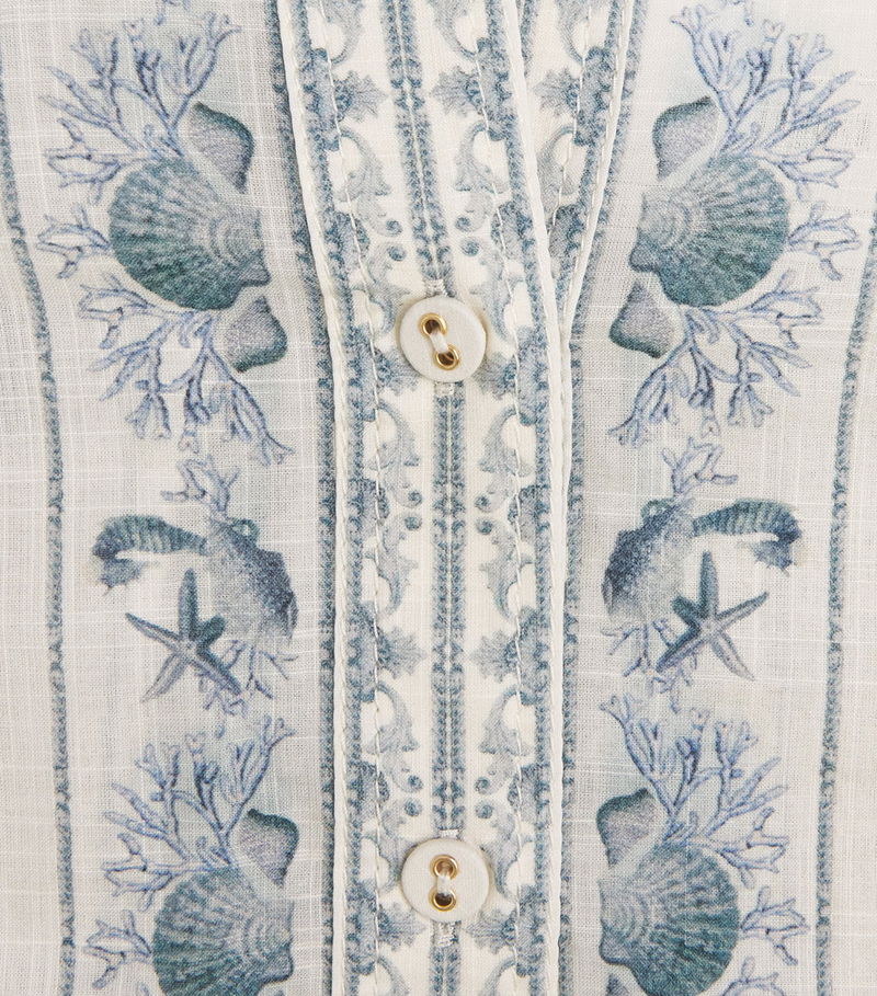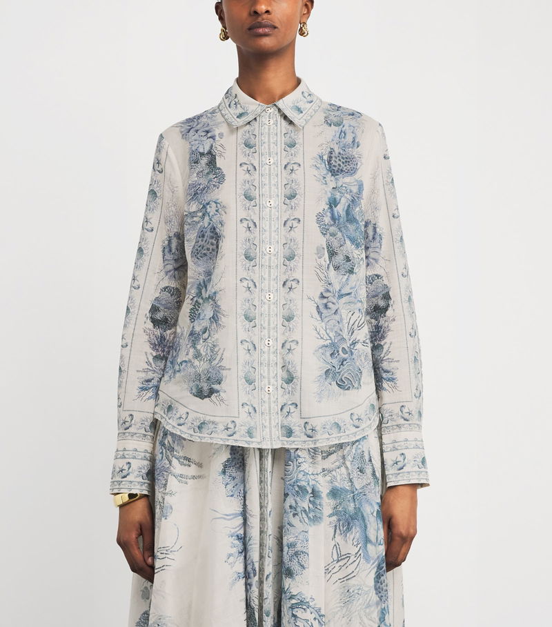 Hailing from Australia, Zimmermann is a fashion brand inspired by the beauty of island life and the carefree spirit of travelling to exciting new destinations. The Wanderlust collection captures this feeling, with each garment carrying a sense of adventure. Made from soft cotton, this shirt features a blue floral pattern interspersed with oceanic anemones.