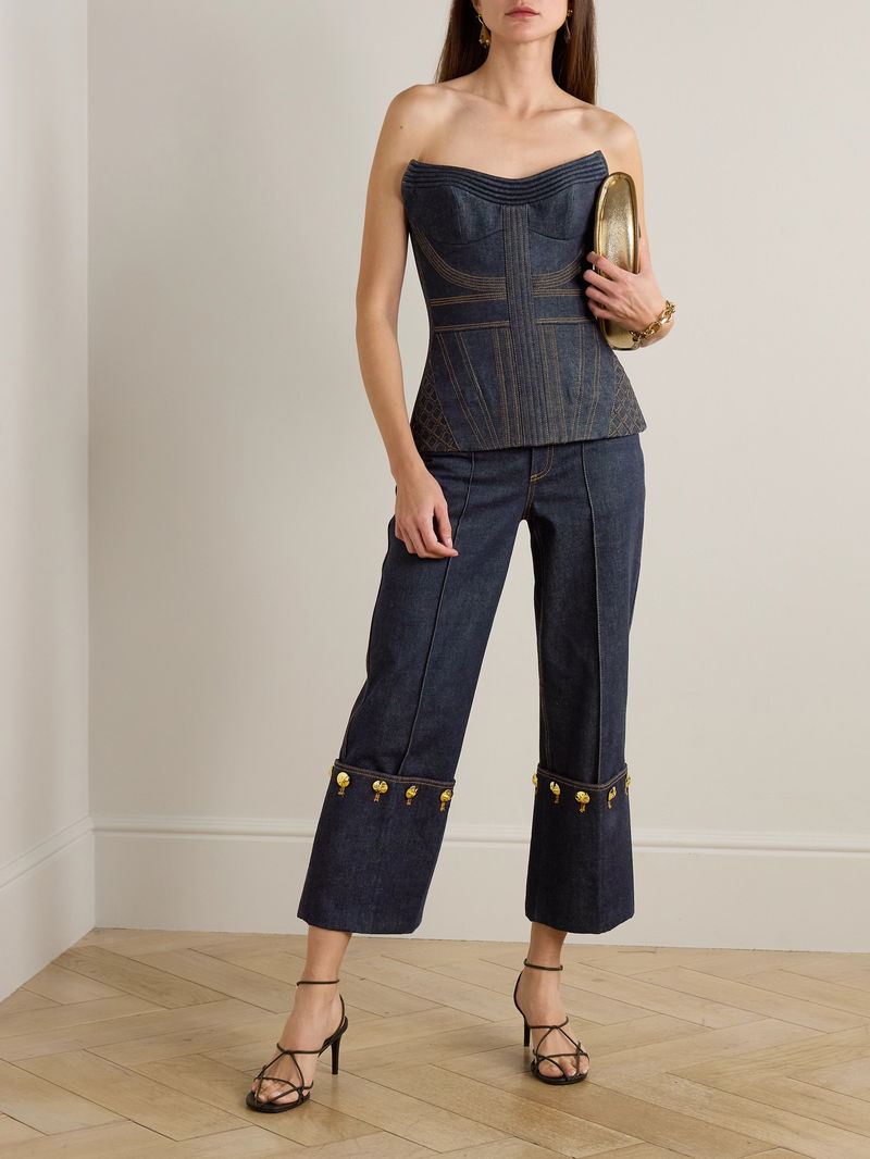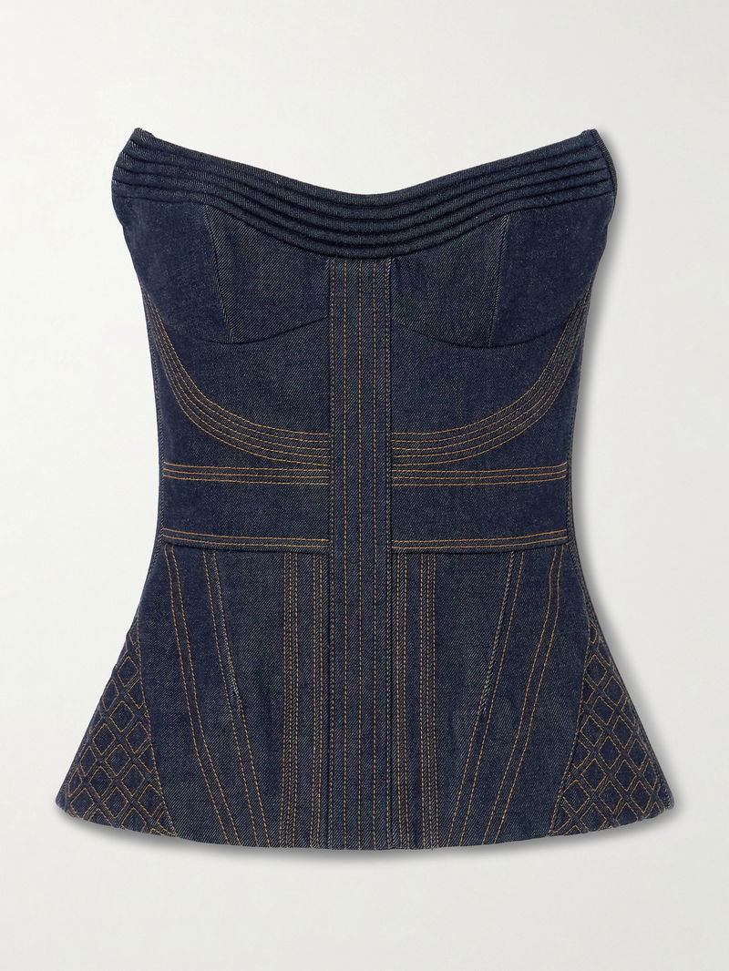Zimmermann's corset top is topstitched to define the hourglass shape. It's made from denim with a sharp, structured neckline. Wear yours with high-waisted pants or a maxi skirt.