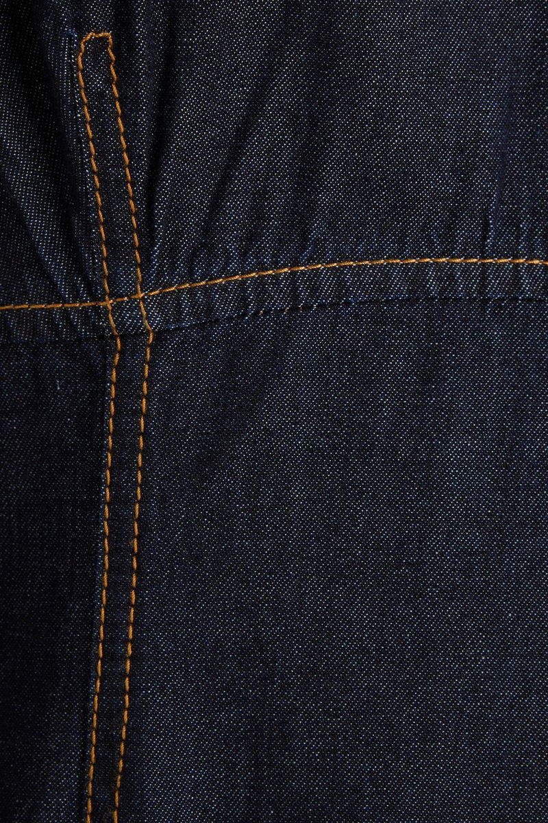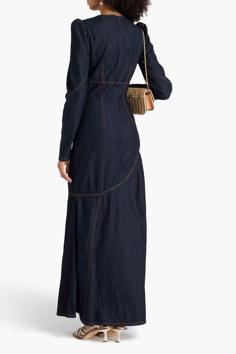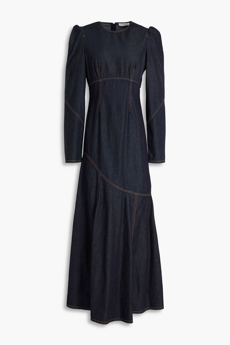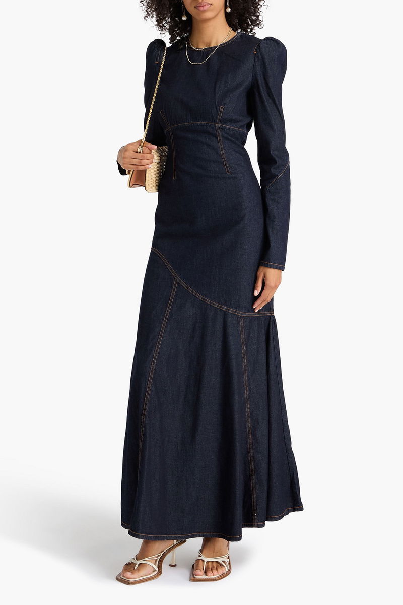 Dress, Denim, Gathered, Puffed sleeves, Fluted hem, Concealed zip fastening along back, Mid-weight, non-stretchy fabric.