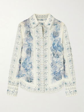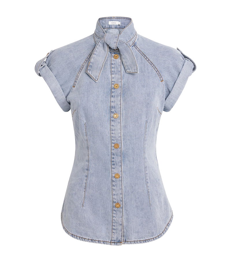 For its Cruise 2026 collection, titled Twisted Romance, Zimmermann draws inspiration from nostalgic pirate adventures and the extravagance of the New Romantics movement. A duel of softness and structure is explored with pieces like this tie-neck shirt, cut from tailored denim with a soft cotton hand feel.