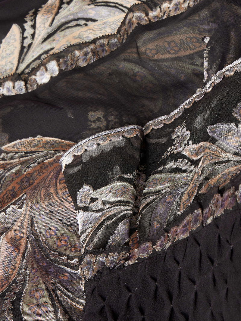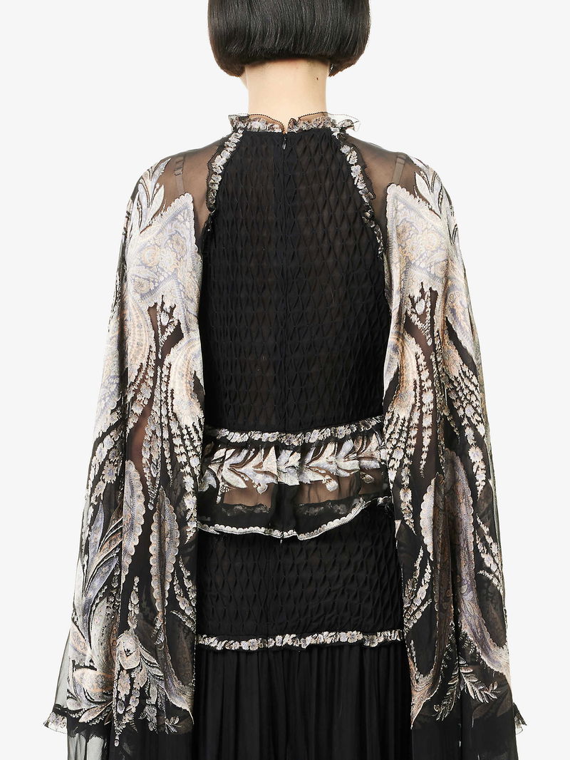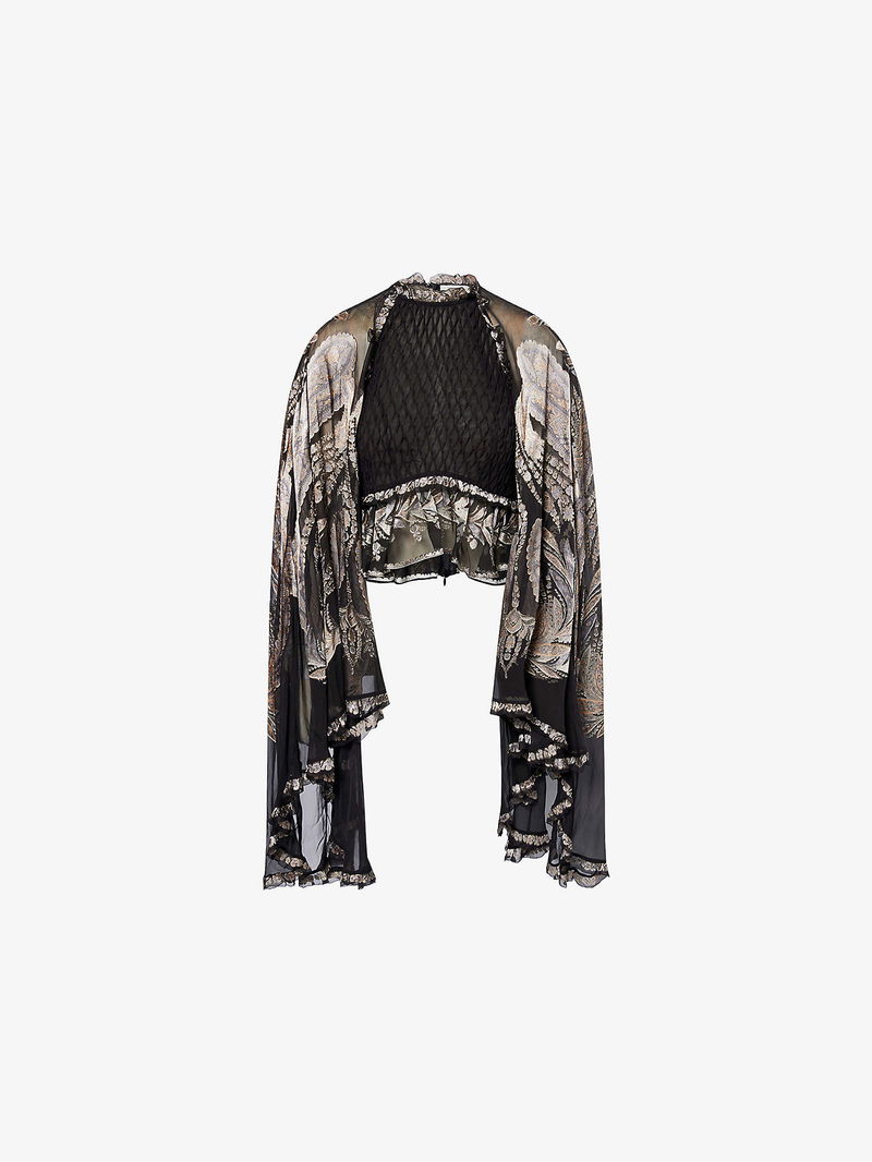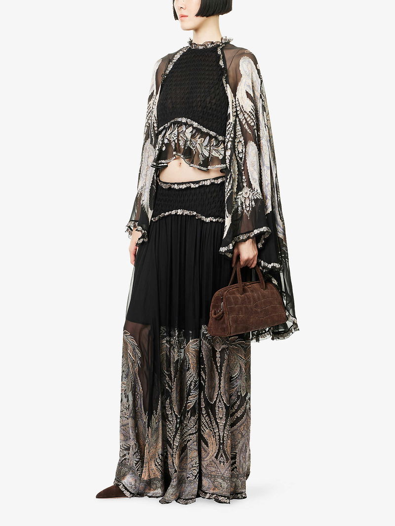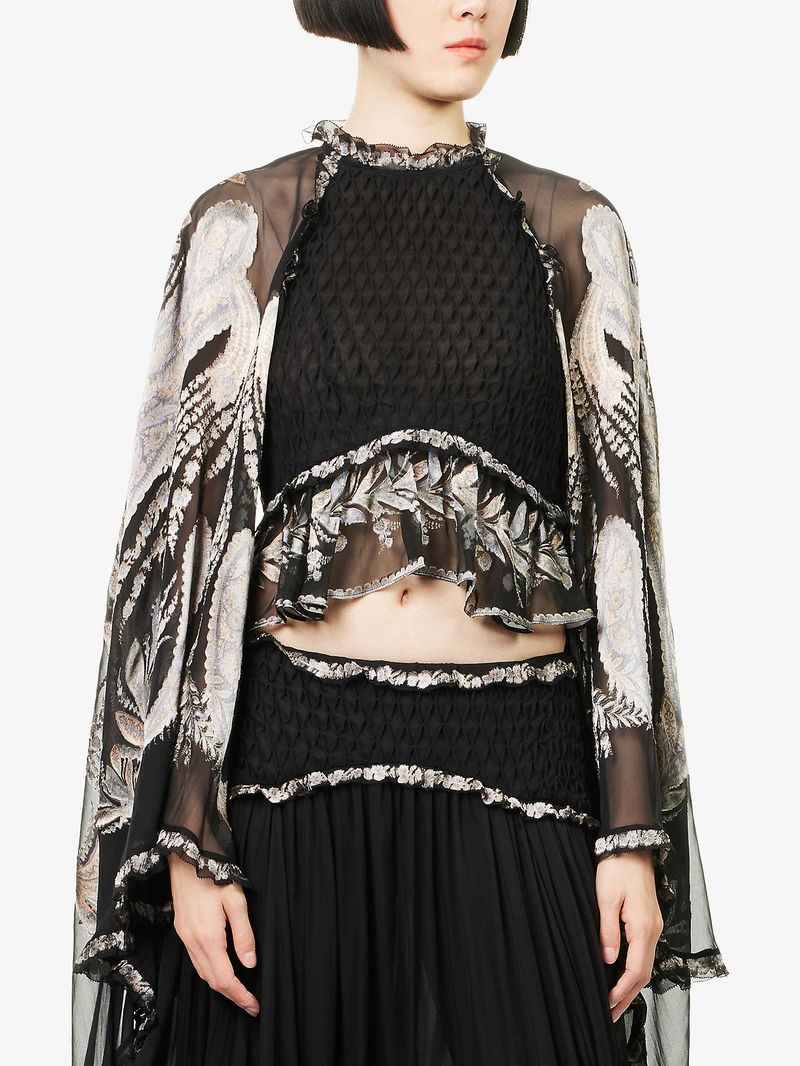 Zimmermann woven top. Regular fit, cropped, round-neck, raglan long sleeves, bell sleeves, contrast textured panel at front and back, all-over paisley and floral print, all-over satin texture, frilled trims.