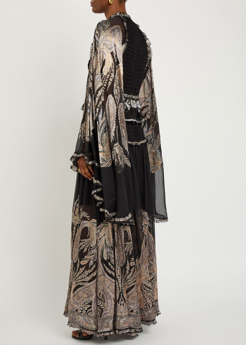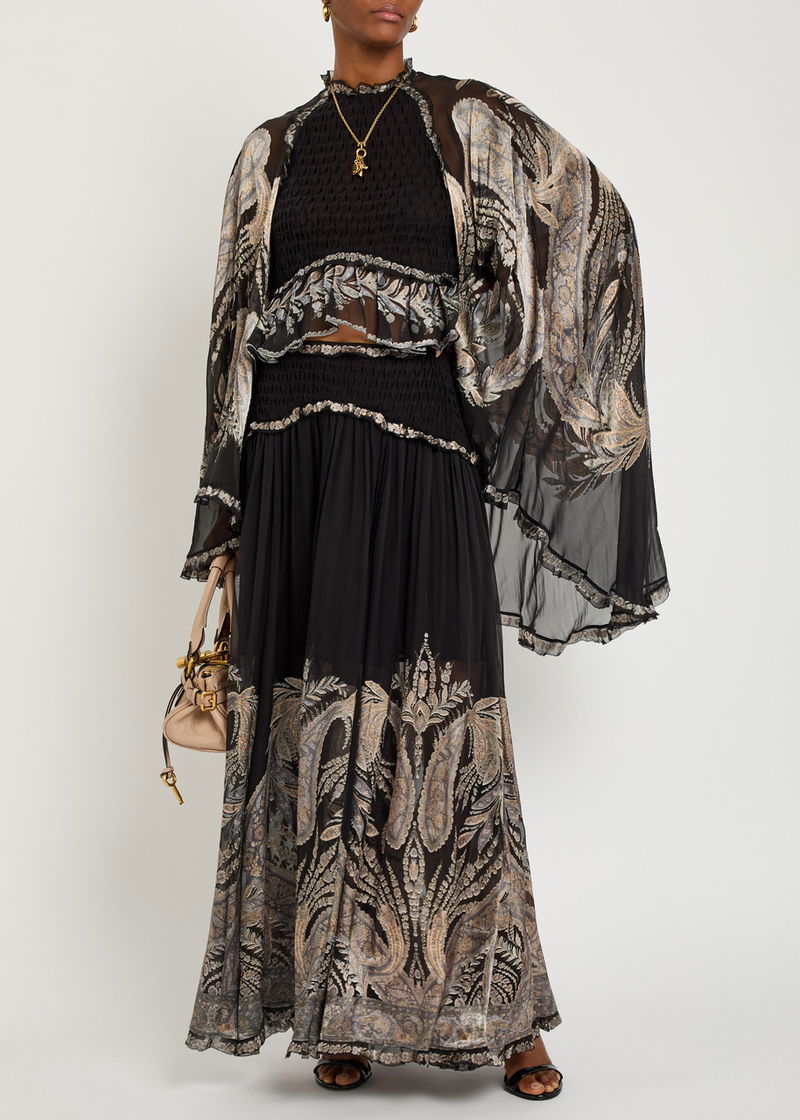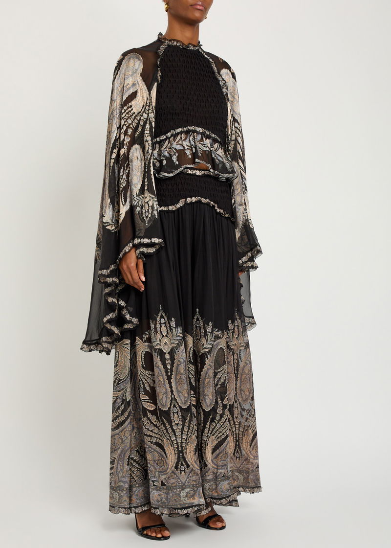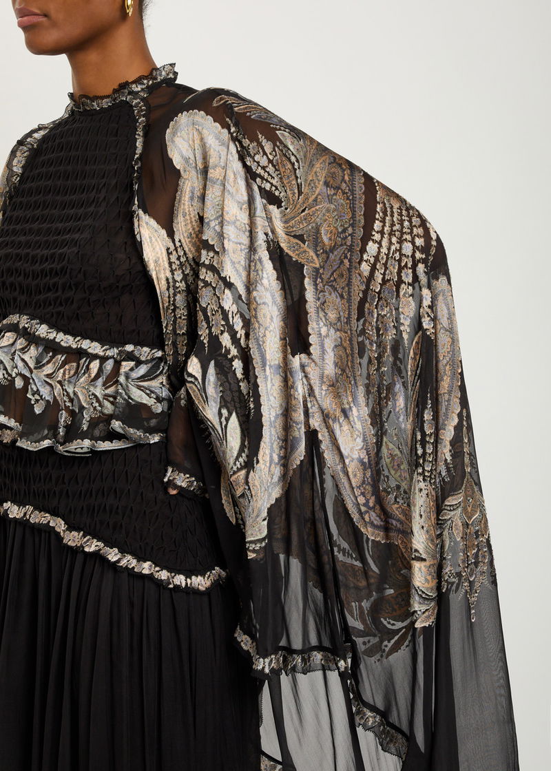 • Printed, round-neck, semi-sheer draped raglan sleeves, ruffled trims
