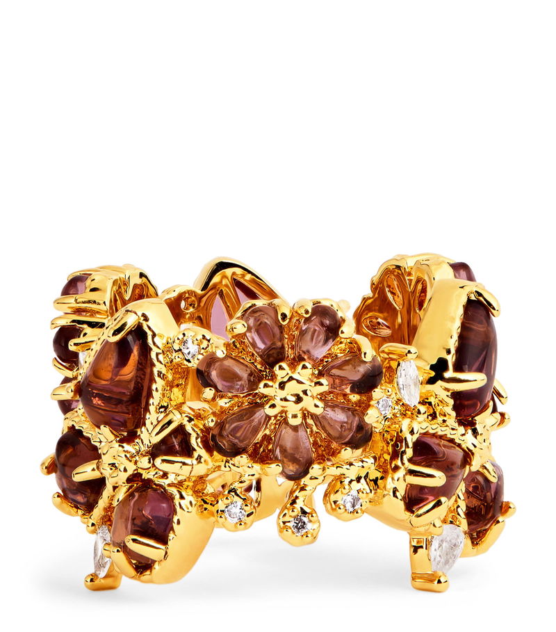 This ring from the Cruise 2026 collection, titled Twisted Romance, channels the line's inspiration of nostalgic pirate tales and the glamour of the New Romantics era, with its intricate rope-textured, 12-karat gold-plated brass design complemented by an enchanting glass and cubic zirconia stones.
