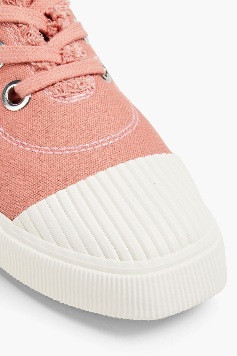 Sneakers, Canvas, Frayed trims, Square toe, Lace-up front, Lined in leather, Rubber sole.