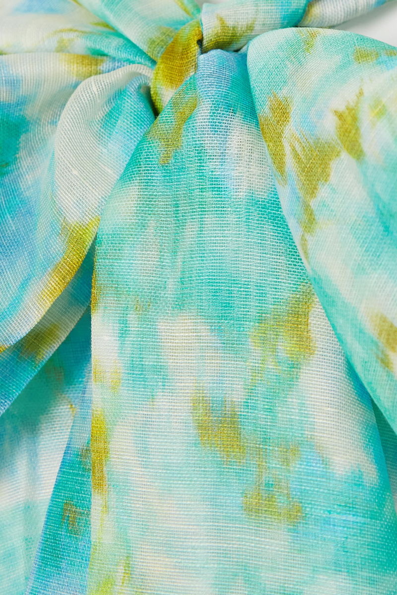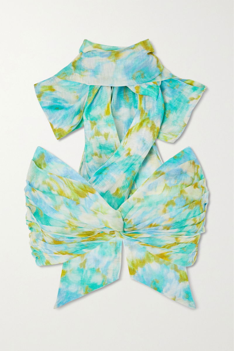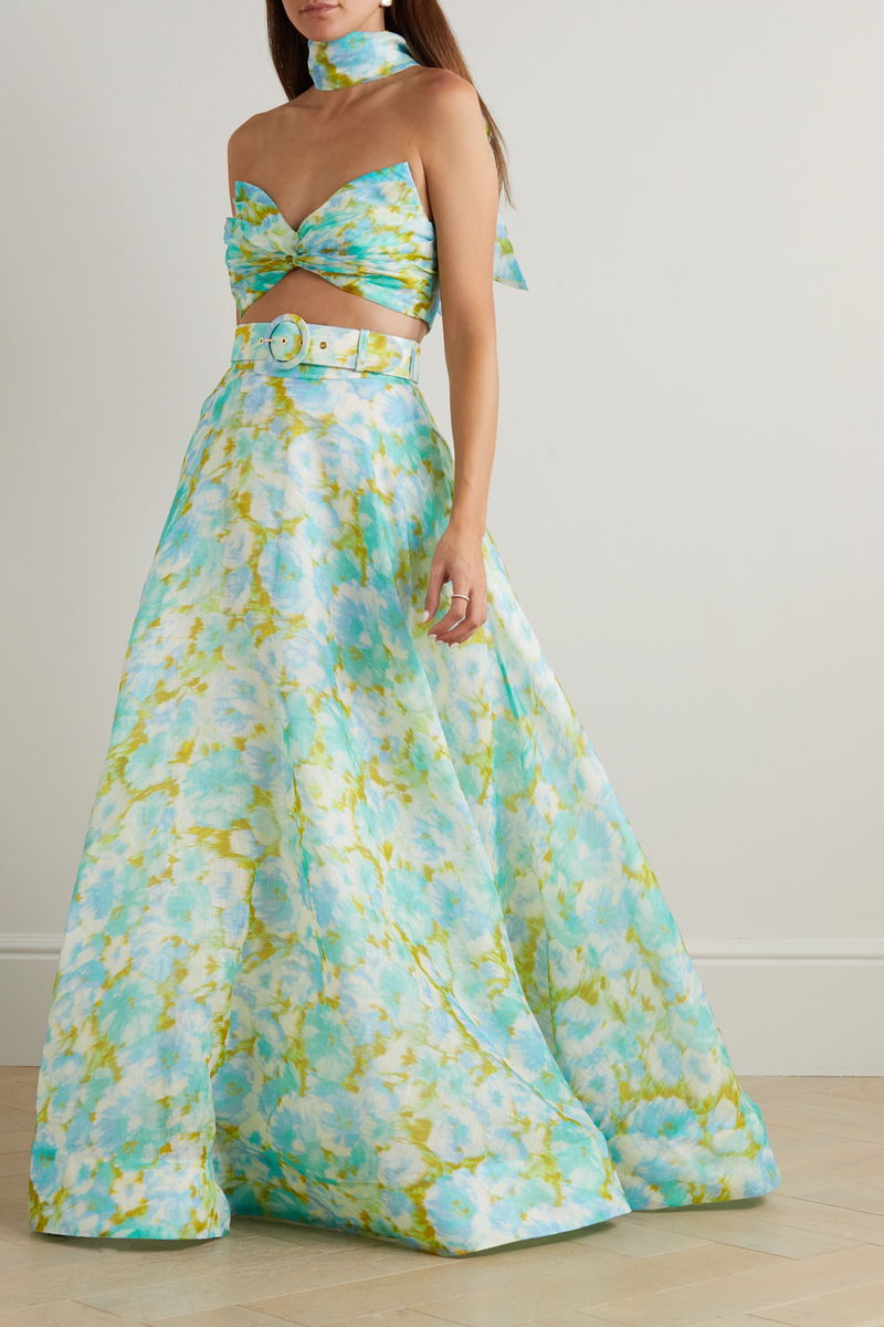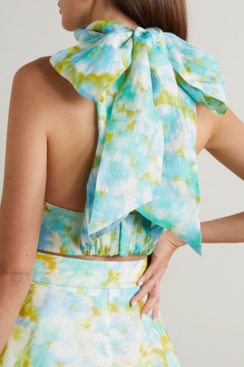 From the Resort '23 'High Tide' collection, Zimmermann's cropped top is cut from a linen and silk-blend printed with vibrant watercolor blooms – it's like a wearable piece of art. It has a twist-front and high neck that ties into a beautiful bow at the back. Style yours with the coordinating skirt.