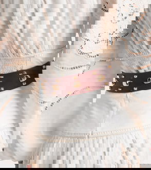 Belt, Leather, Gold hardware, Buckle fastening.