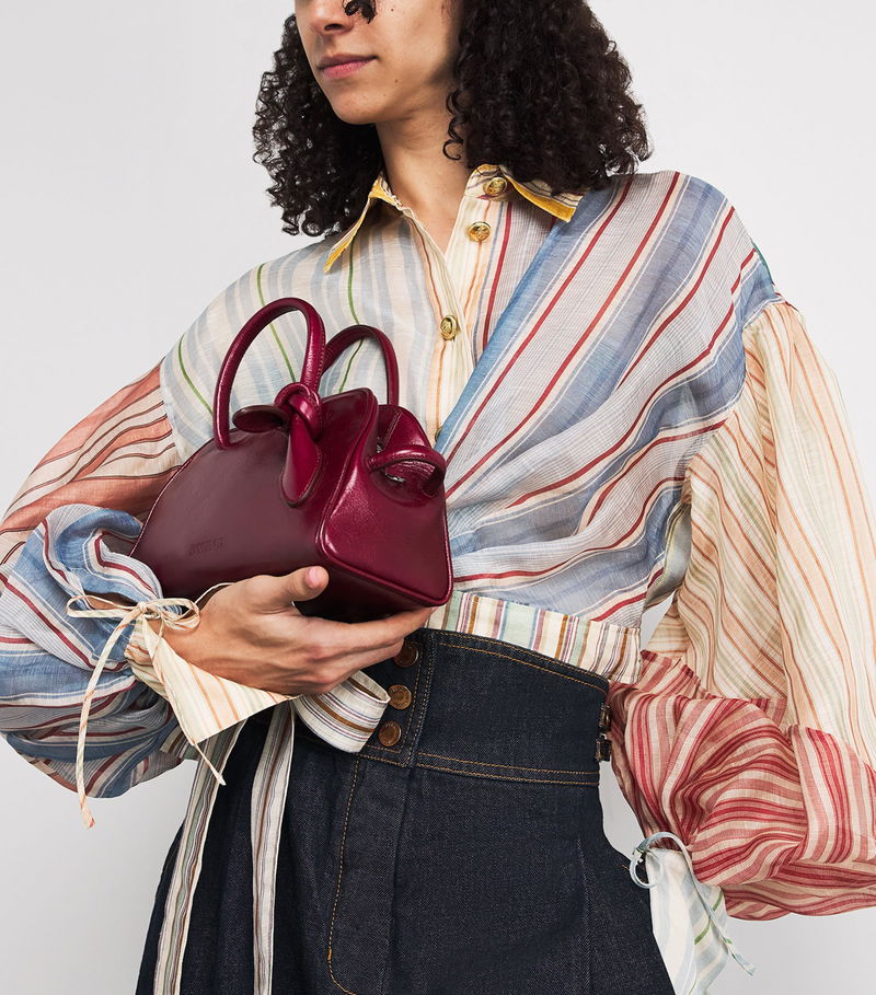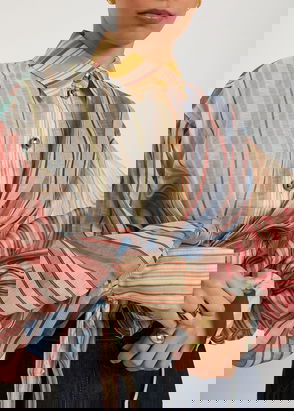 A story of volume and bold detailing unfolds with pieces like the Rebellion blouse, showcasing statement stripes on a billowing frame.