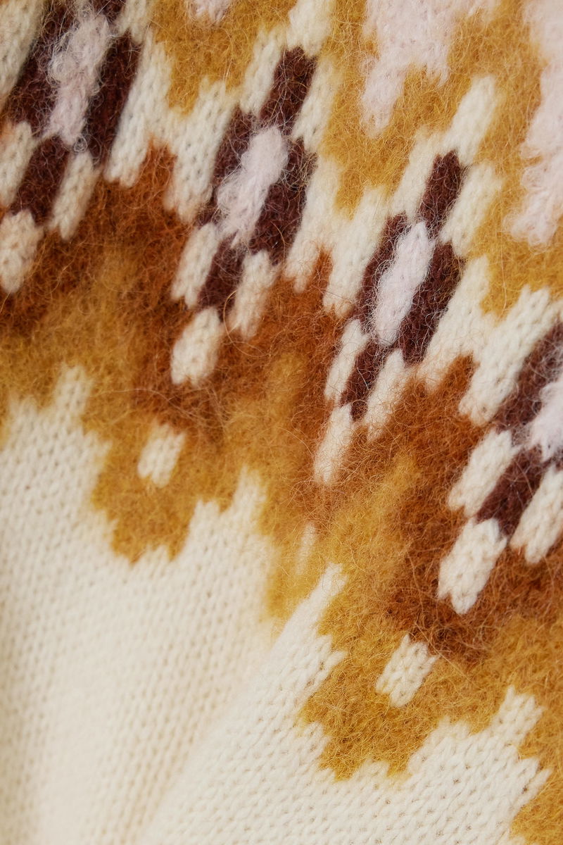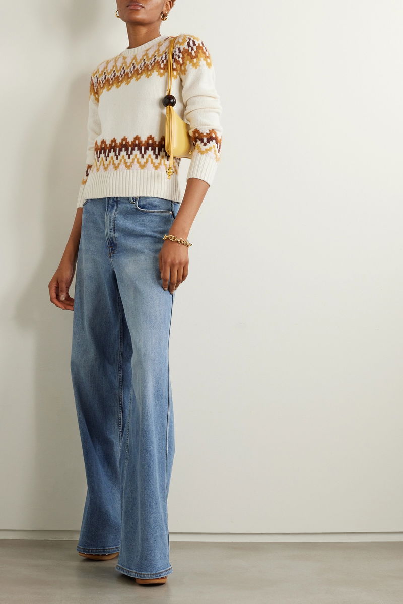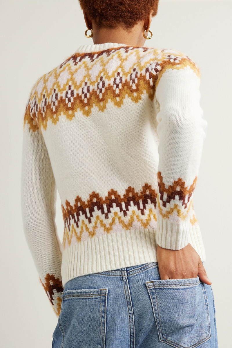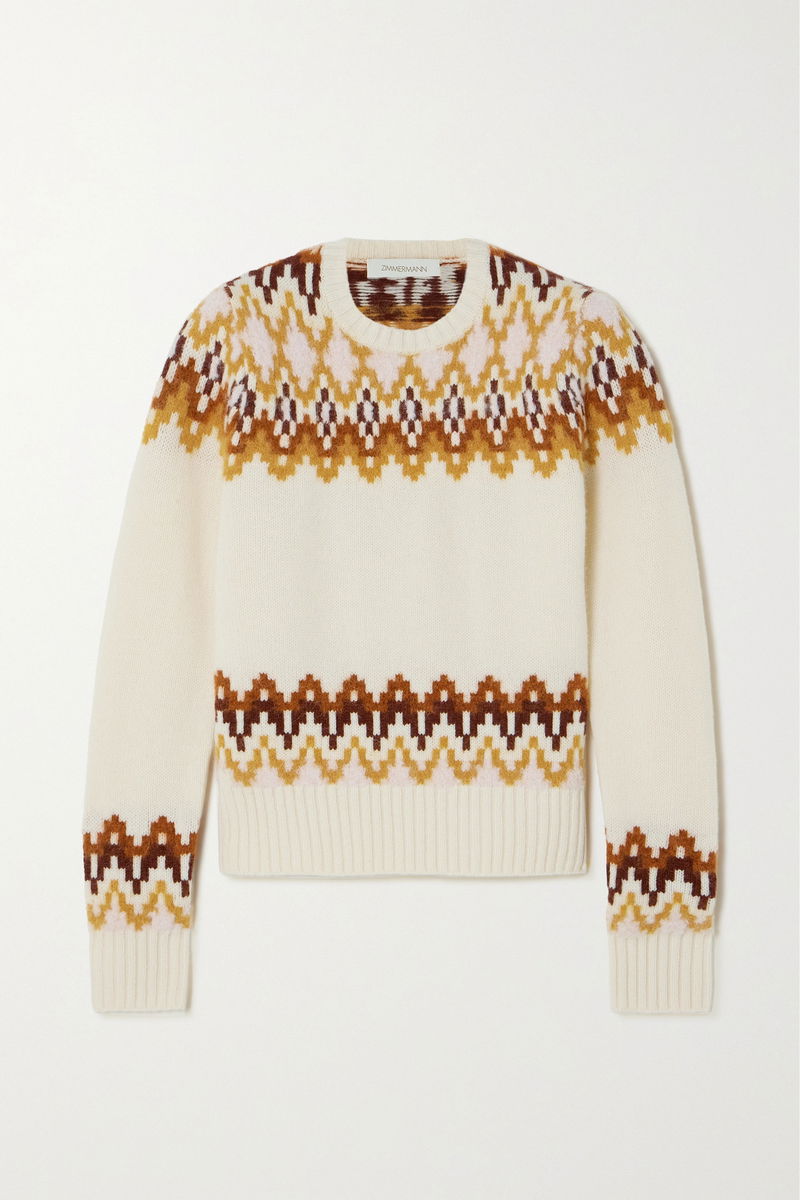 Zimmermann's 'Lyrical' sweater is knitted in a traditional Fair Isle pattern, but done to create a modern, almost pixelated effect. Spun from a blend of merino wool with a touch of fuzzy alpaca, it has a thick, soft handle and ribbed trims so if you want to push the sleeves up you can.