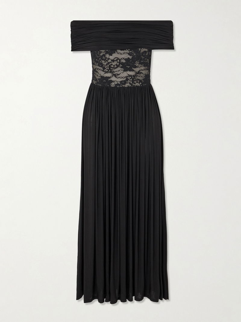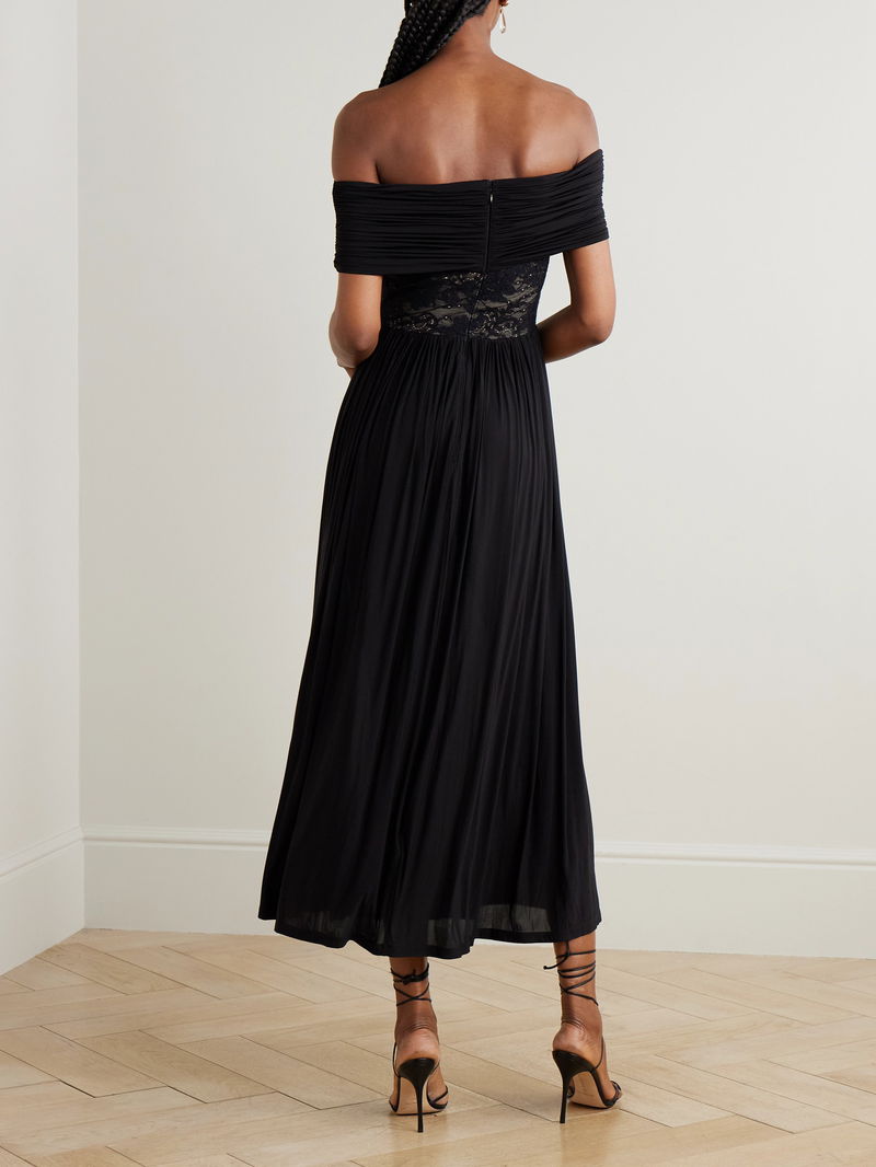 Zimmermann's collections are imbued with romanticism. This maxi dress is made from gathered stretch-jersey using certified forest-friendly viscose that's turned into a fiber using the pulp from trees. It has an off-the-shoulder neckline and intricate lace panel through the waist.