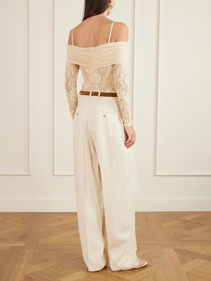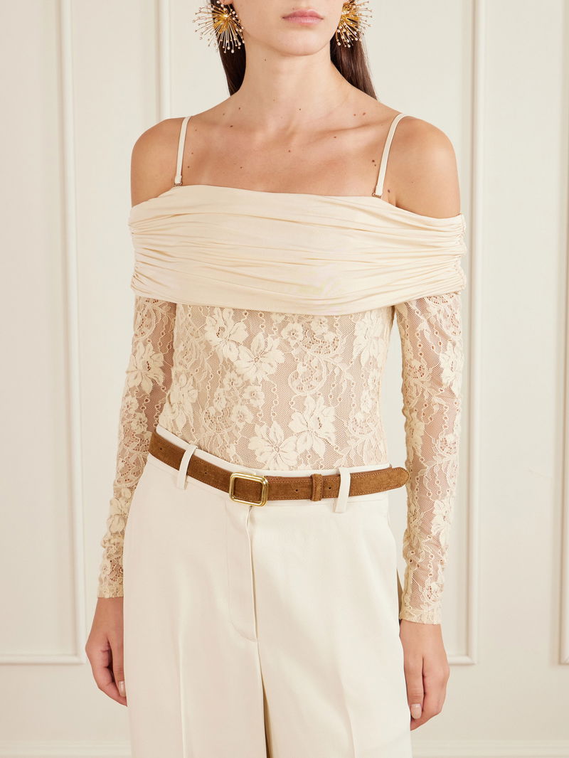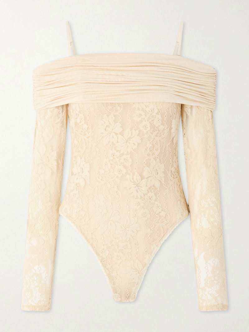 Off-the-shoulder Ruched Jersey And Stretch-lace Bodysuit
