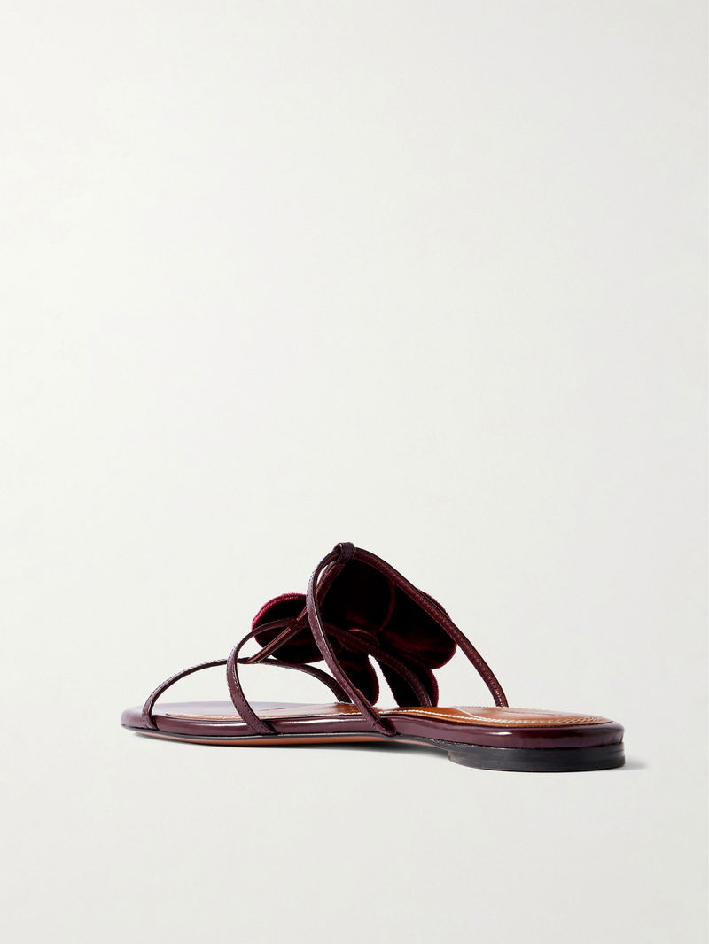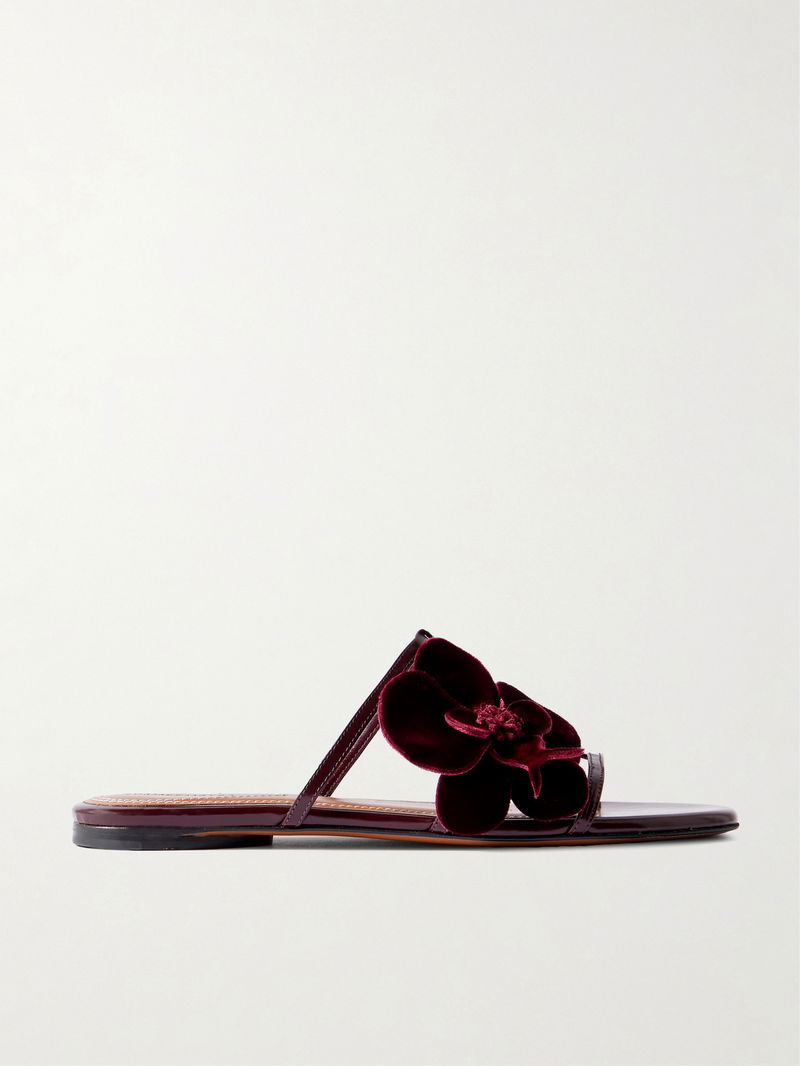 Orchid Appliquéd Velvet-trimmed Glossed-leather Slides