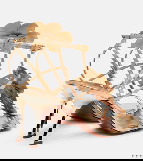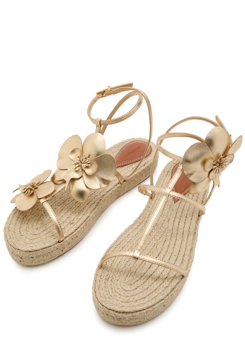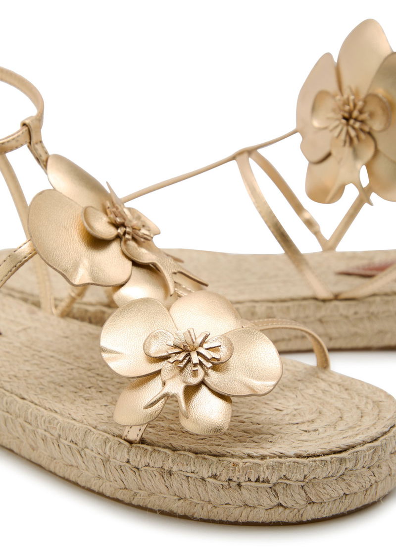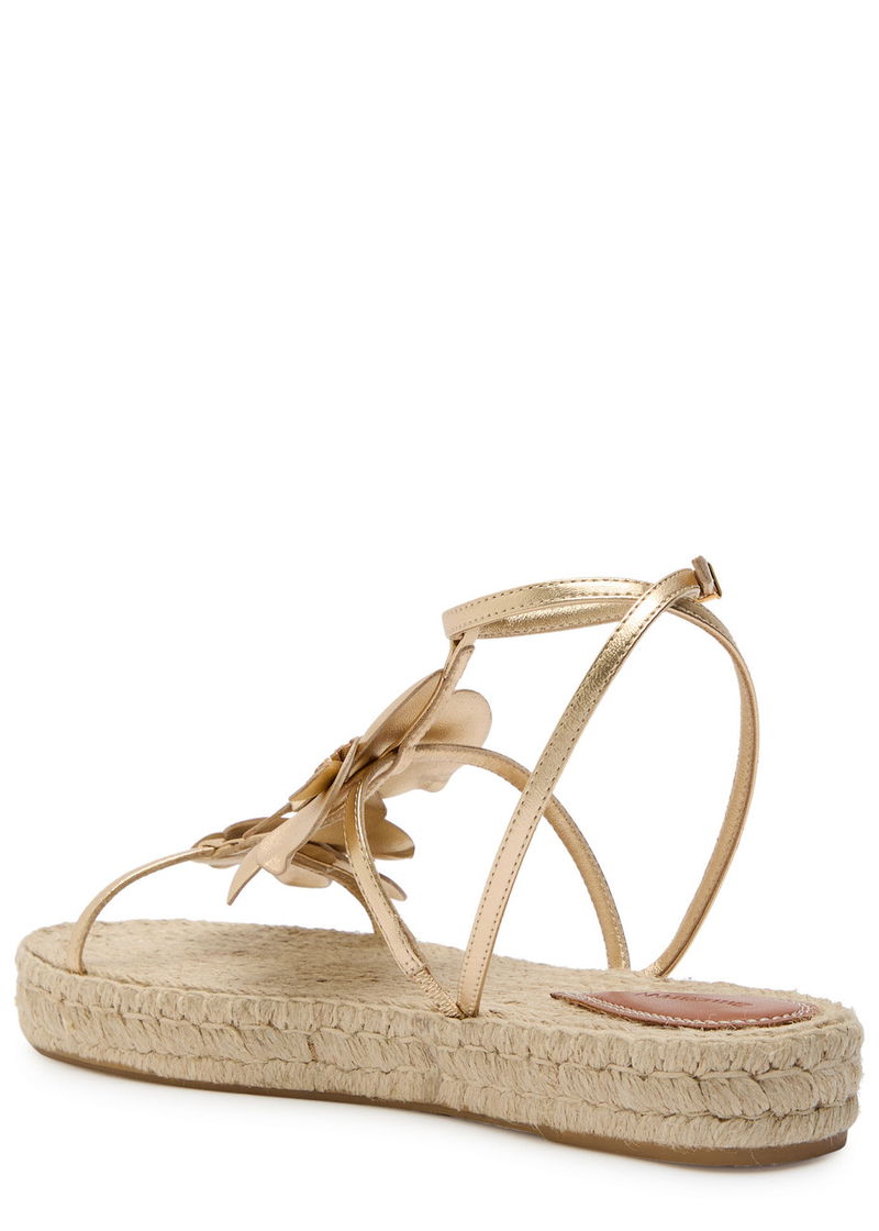 Zimmermann metallic leather espadrille sandals. Floral appliqués, open round toe. Adjustable buckle-fastening ankle strap.