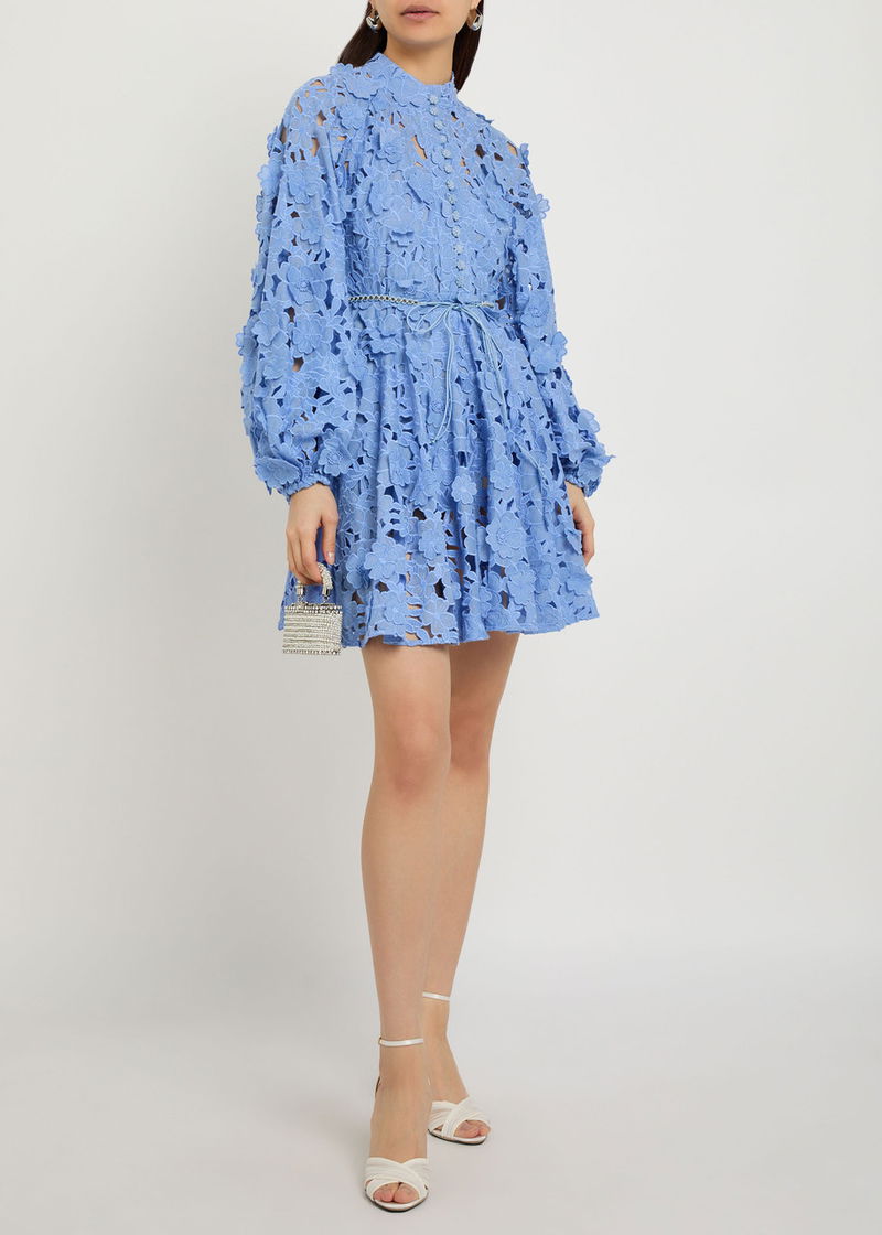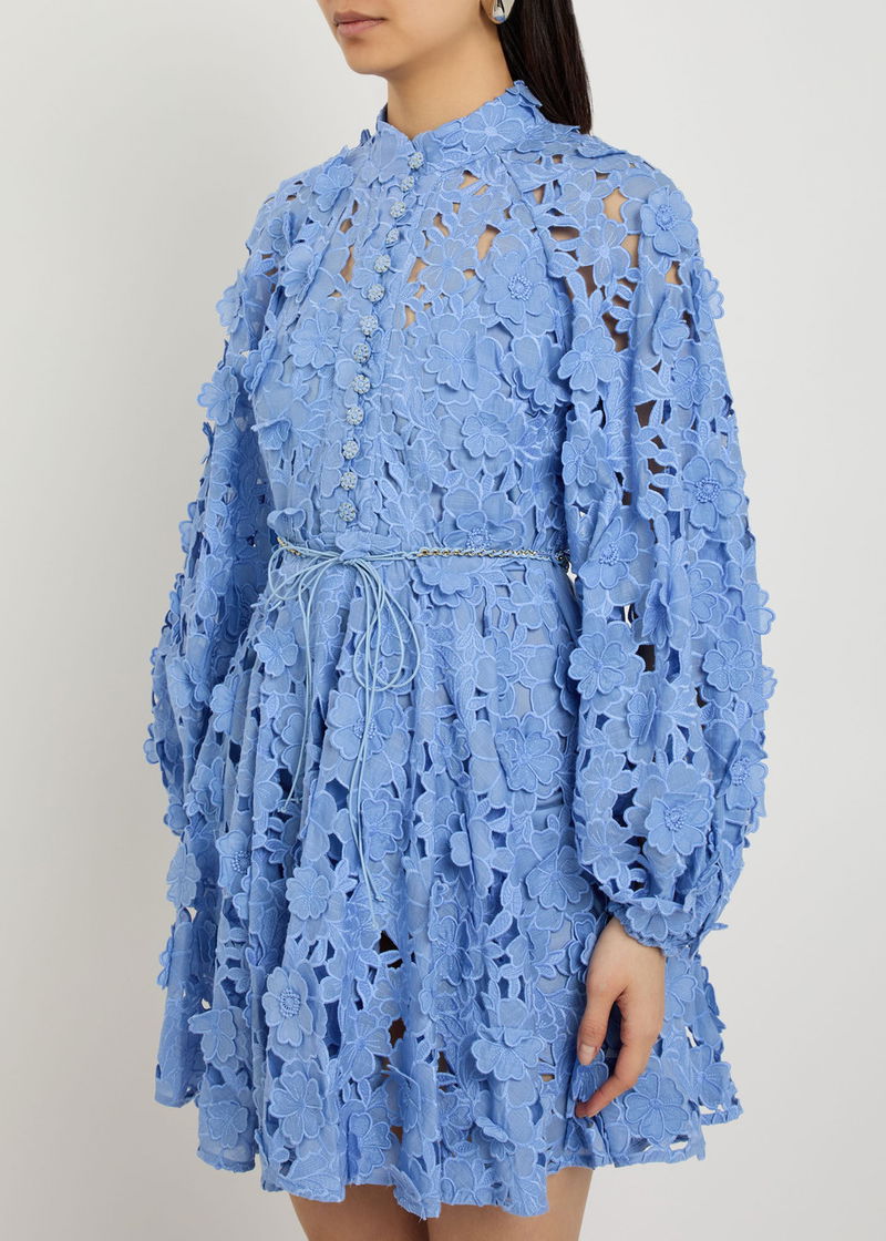 Zimmermann cotton dress. Open floral embroidery, round-neck, raglan sleeves, elasticated cuffs, belt loops, belt, internal slip dress lining. Concealed zip fastening through back.
