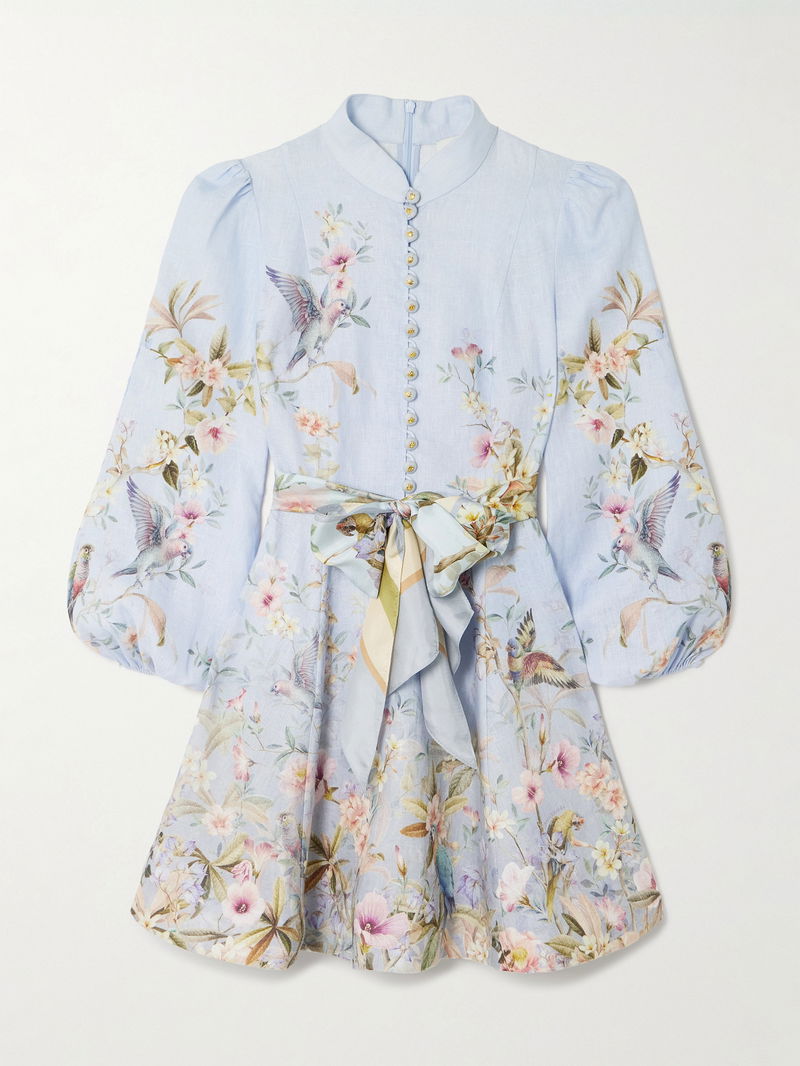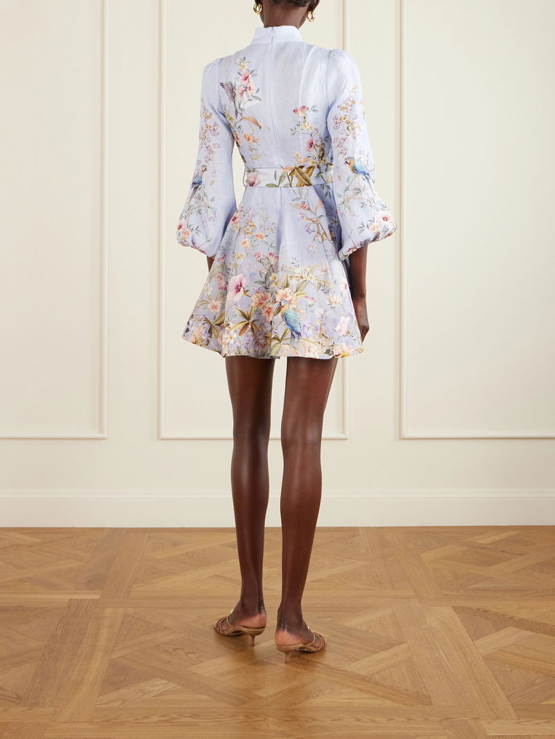 The detailed print mapping Zimmermann's 'Rebellion' mini dress feels reminiscent of historic tapestries. It's cut from airy linen with lightly puffed sleeves and cinched with a languid sash belt to gather the skirt.