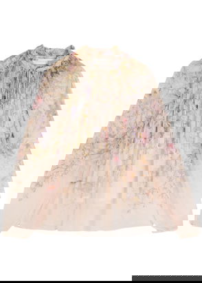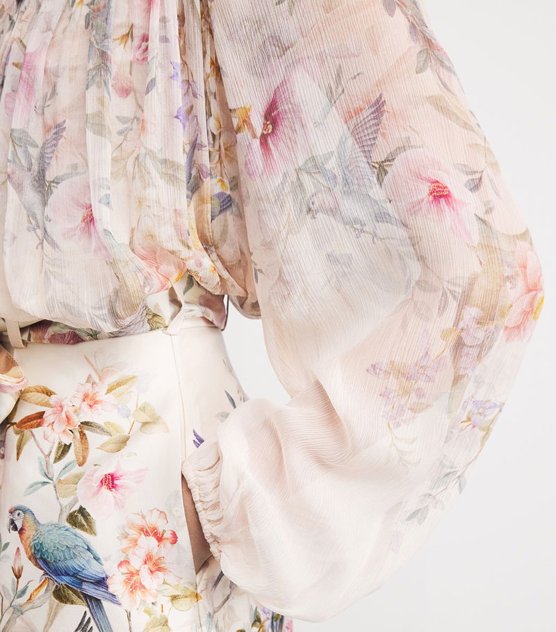 Complemented by a relaxed fit, the sheer fabric of this piece is adorned with an illustrative print of vibrant blooms and birds, drawing upon influences of the flora and fauna variety.