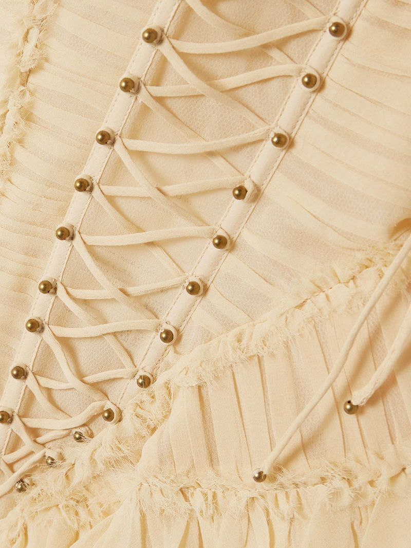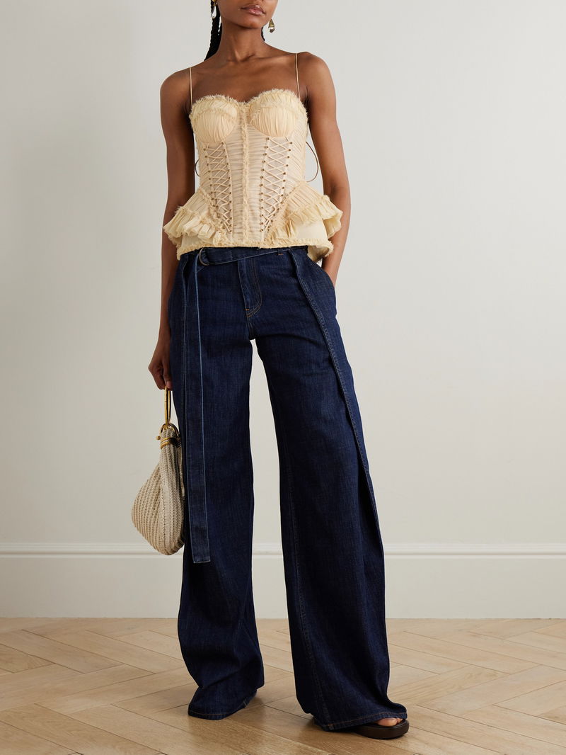 Zimmermann's 'Rebellion' corset top is part of the label's 'Twisted Romance' Cruise '26 collection, which draws on pirate tales and the New Romantics. It's made from ruched silk with internal boning and has lace-up detailing and a peplum hem.