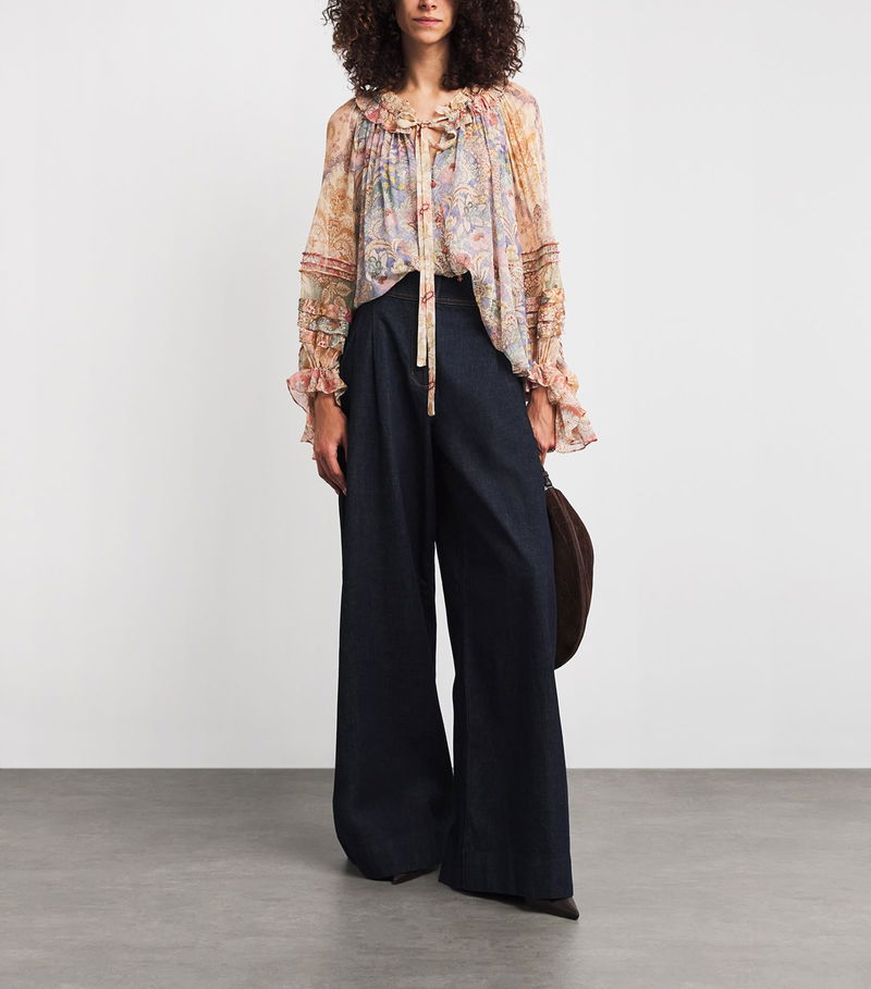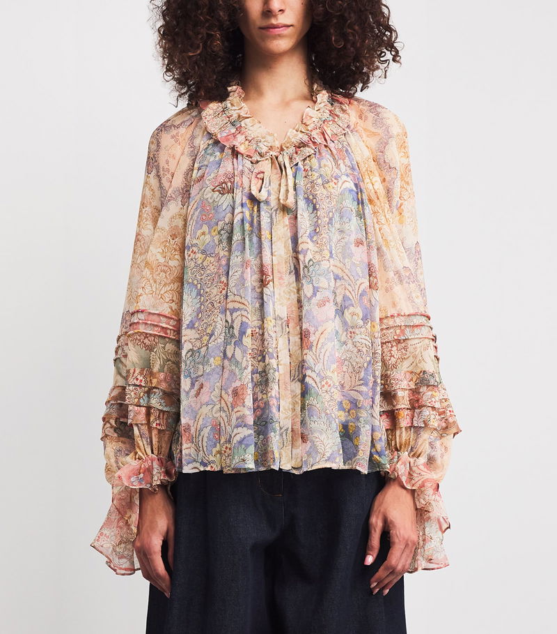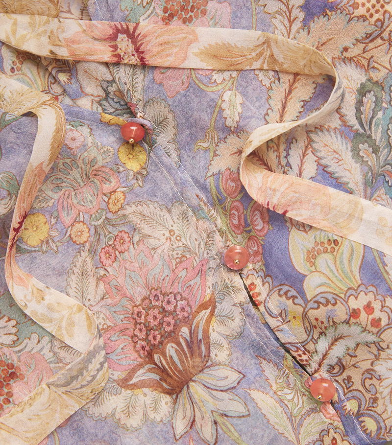 This season, Zimmermann channels a wayward spirit, with its Cruise 2026 collection, titled Twisted Romance, drawing inspiration from nostalgic tales of pirates and the extravagance of the New Romantics movement. A story of fluid forms and bold detailing unfolds with pieces like the Rebellion blouse, showcasing statement florals blooming on the heavily gathered frame.