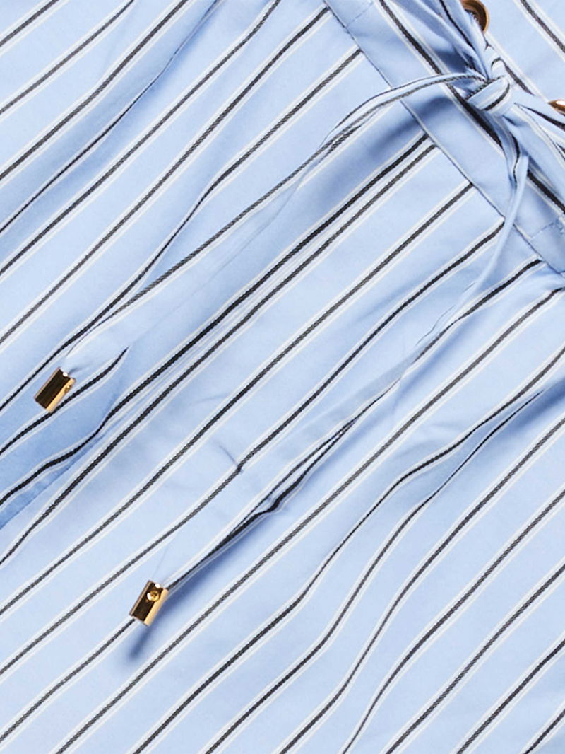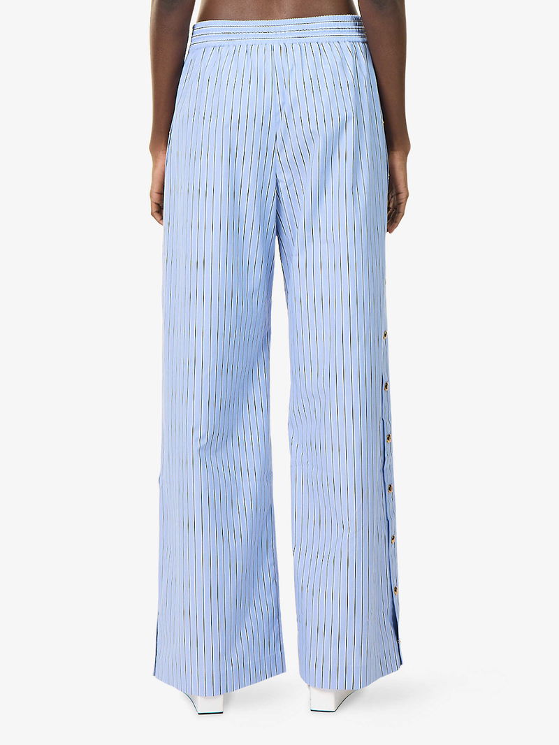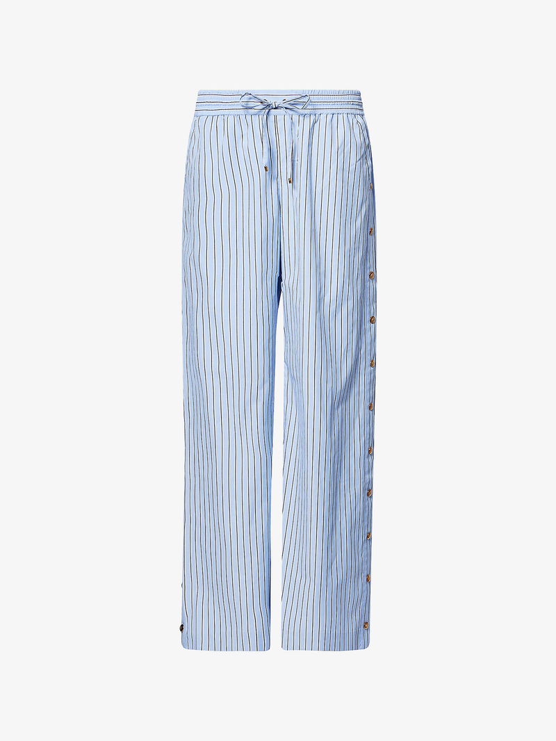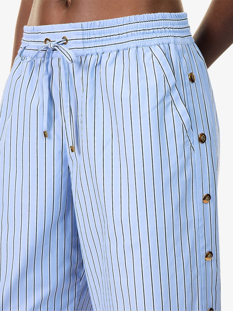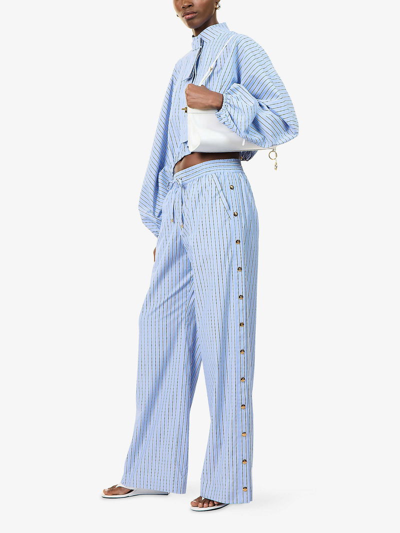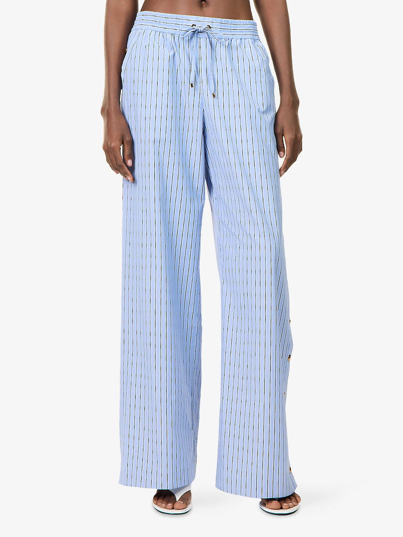 Zimmermann woven trousers. Relaxed fit, mid-rise, straight leg, drawstring elasticated waistband, snap-button trim at sides, stripe pattern.