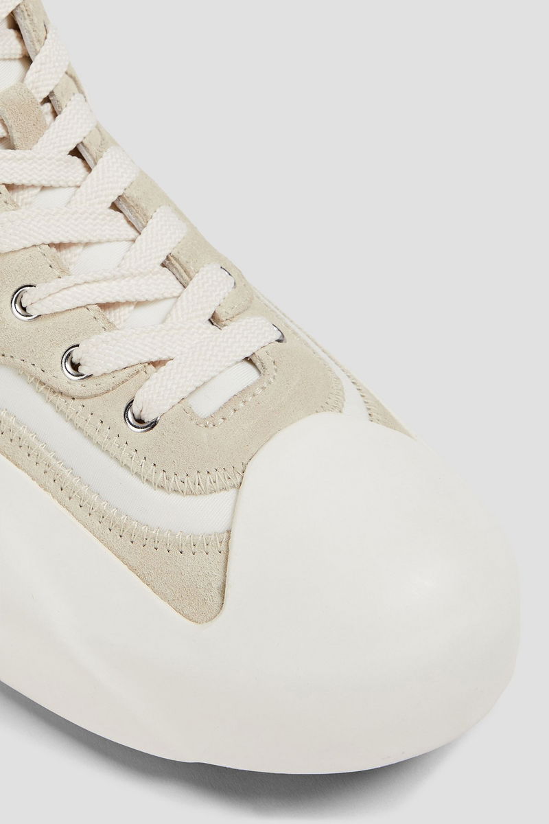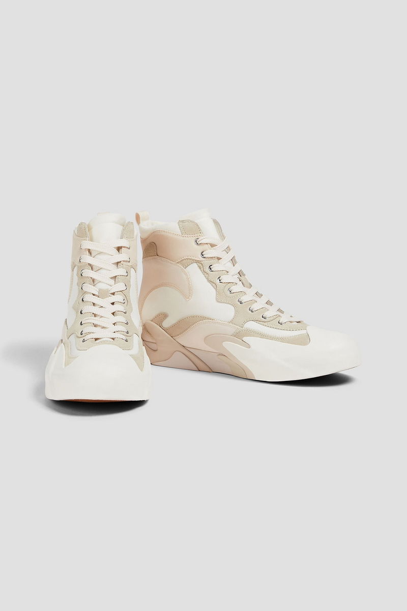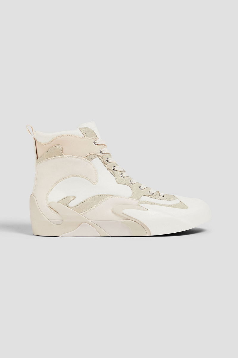 High-top sneakers, Canvas, Pull tabs, Rubber trims, Suede trims, Round toe, Lace-up front, Rubber sole.