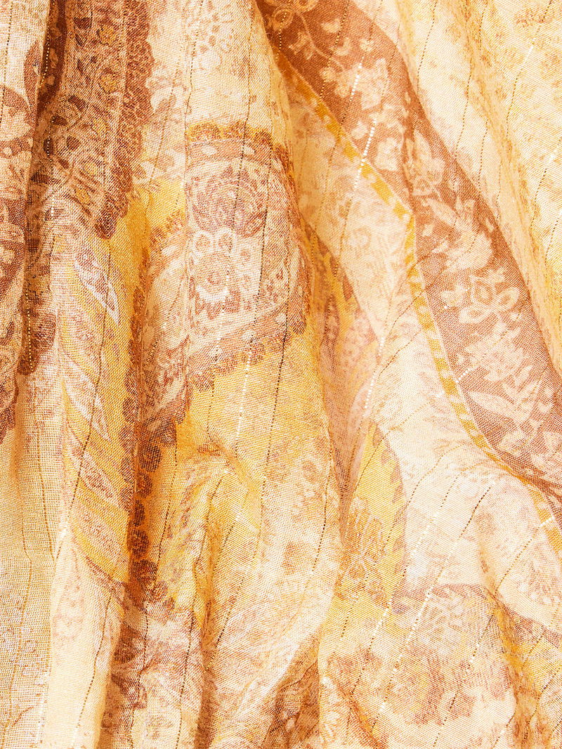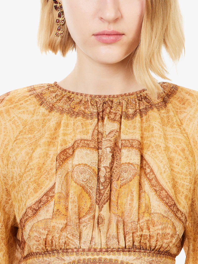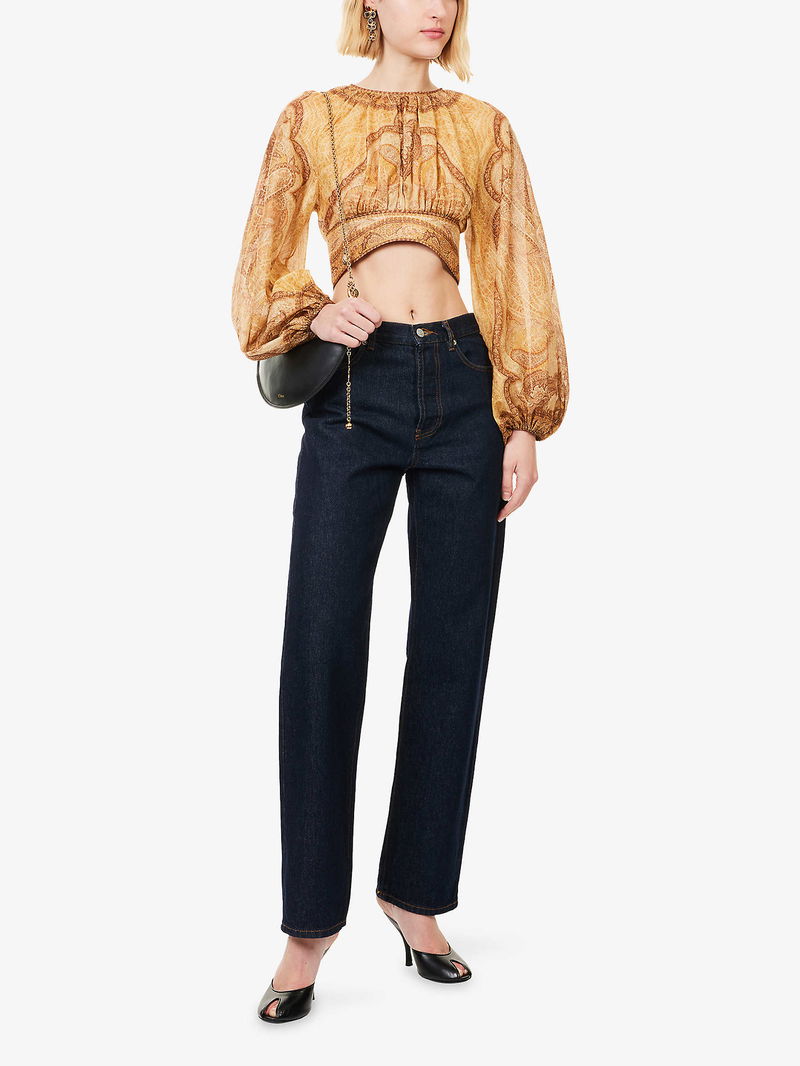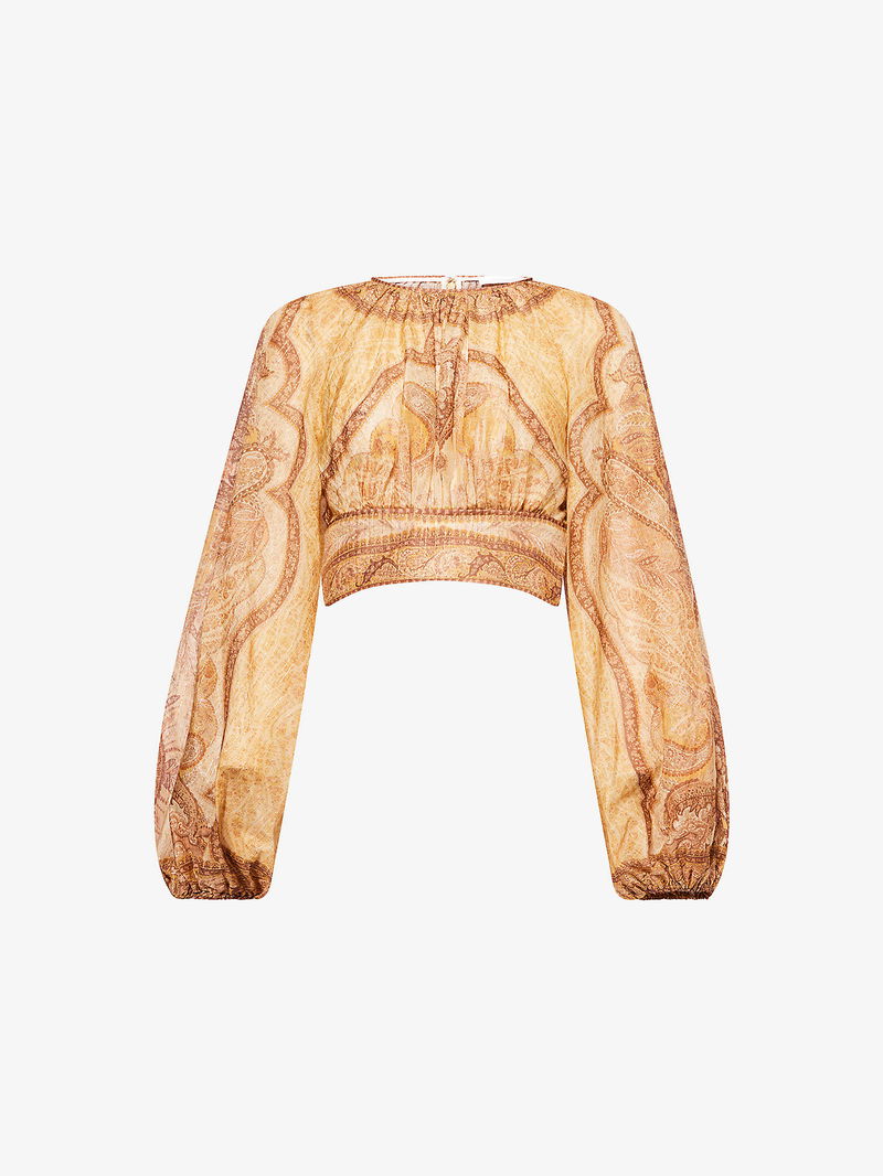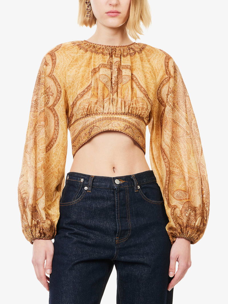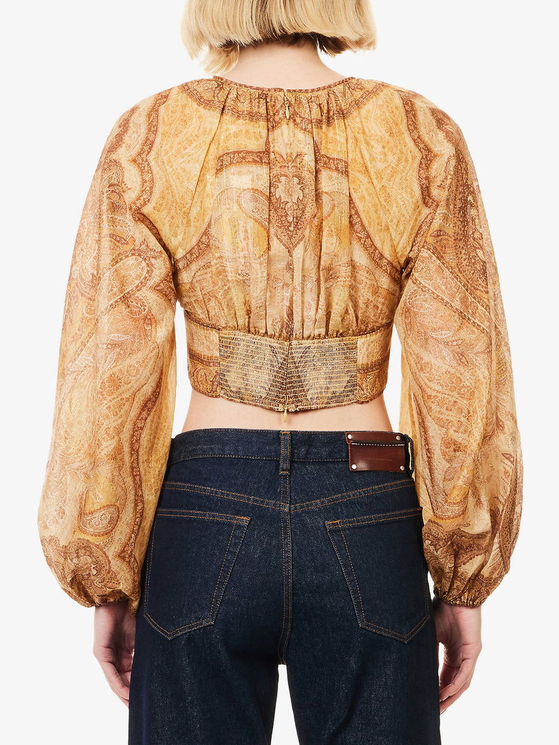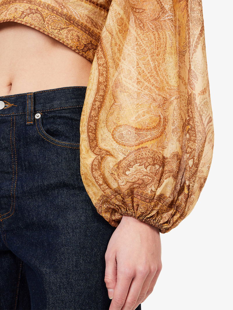 Zimmermann cotton-blend top. Concealed hook-and-eye and zip fastening at back. Regular fit, round neck, long sleeves, elasticated cuffs, elasticated shirred panel at back, all-over paisley pattern, cropped length.