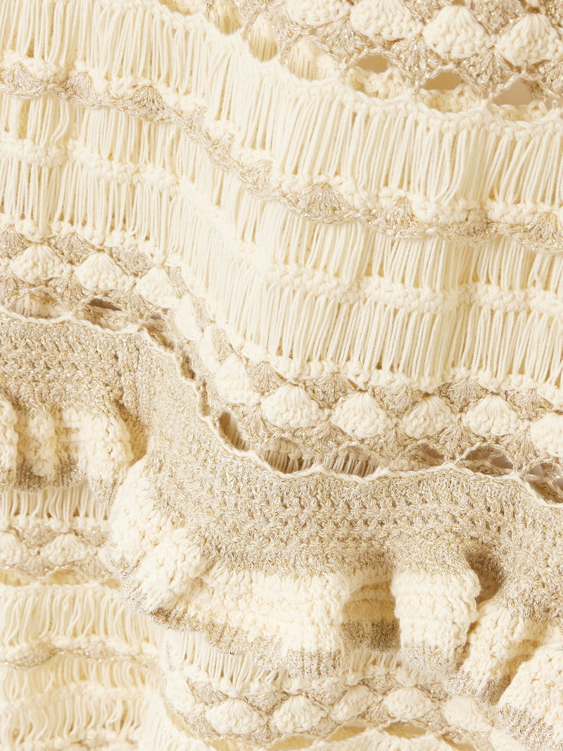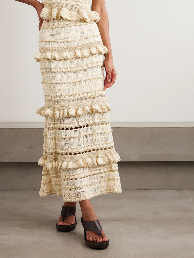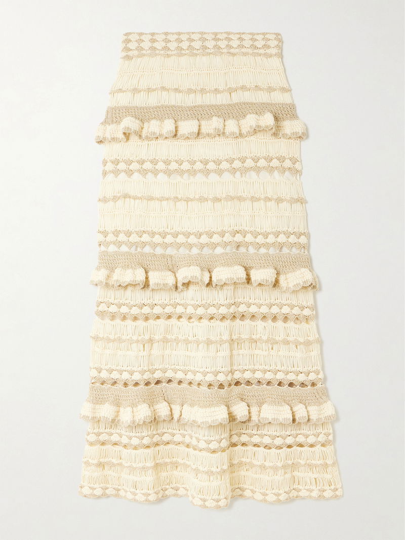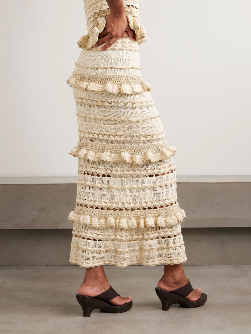 Zimmermann's 'Wanderlust' skirt embodies whimsical elegance with a delicate crocheted weave and flowing silhouette. The golden metallic threads scintillate against the cream base, adding a hint of glamour that's perfect for both daytime and evening occasions. Pair yours with a linen blouse or tank and lace-up sandals.